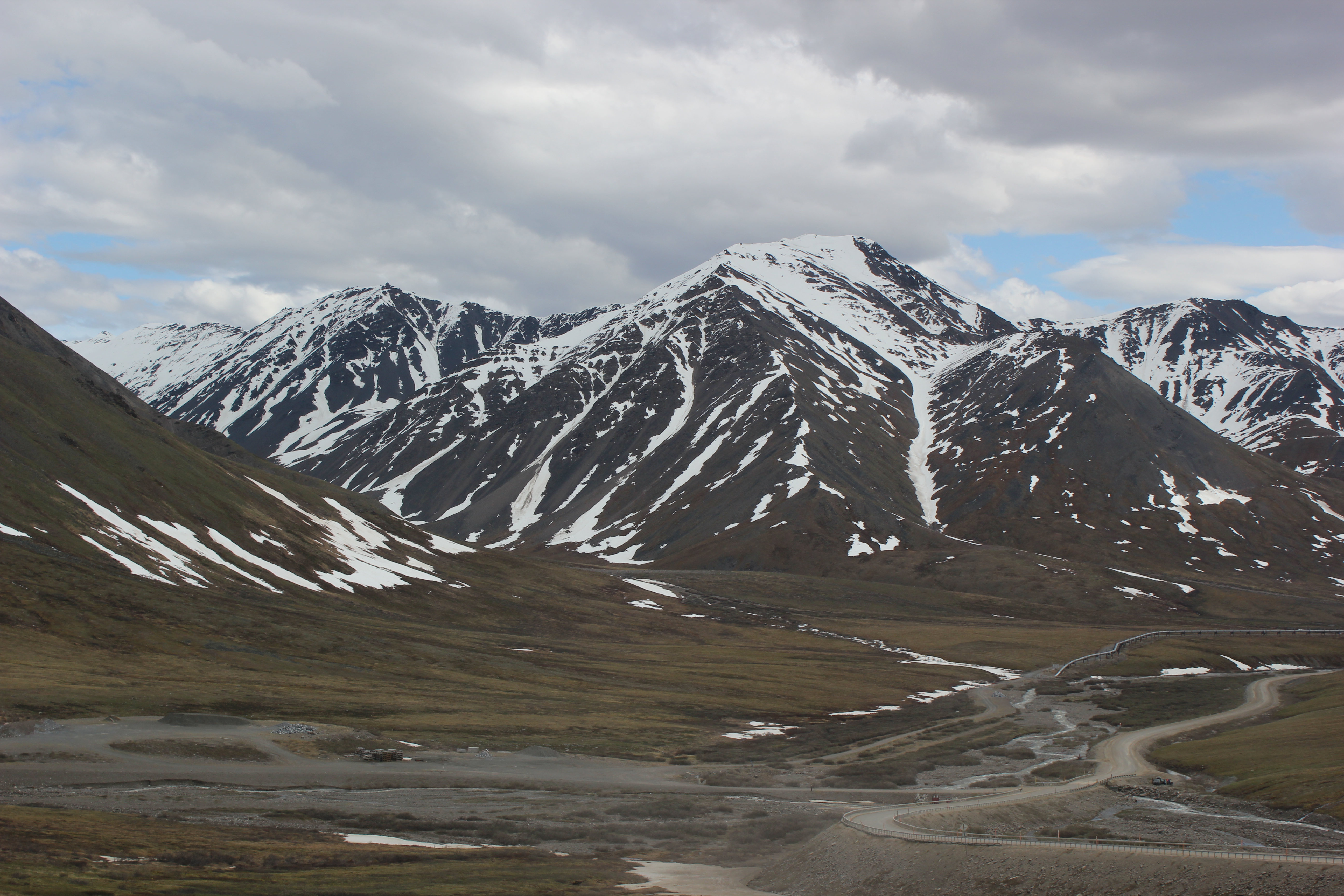 Driving north on Dalton, the team approaches Atigun Pass. The Trans-Alaskan Pipeline is also in view. Dalton Highway, Alaska.