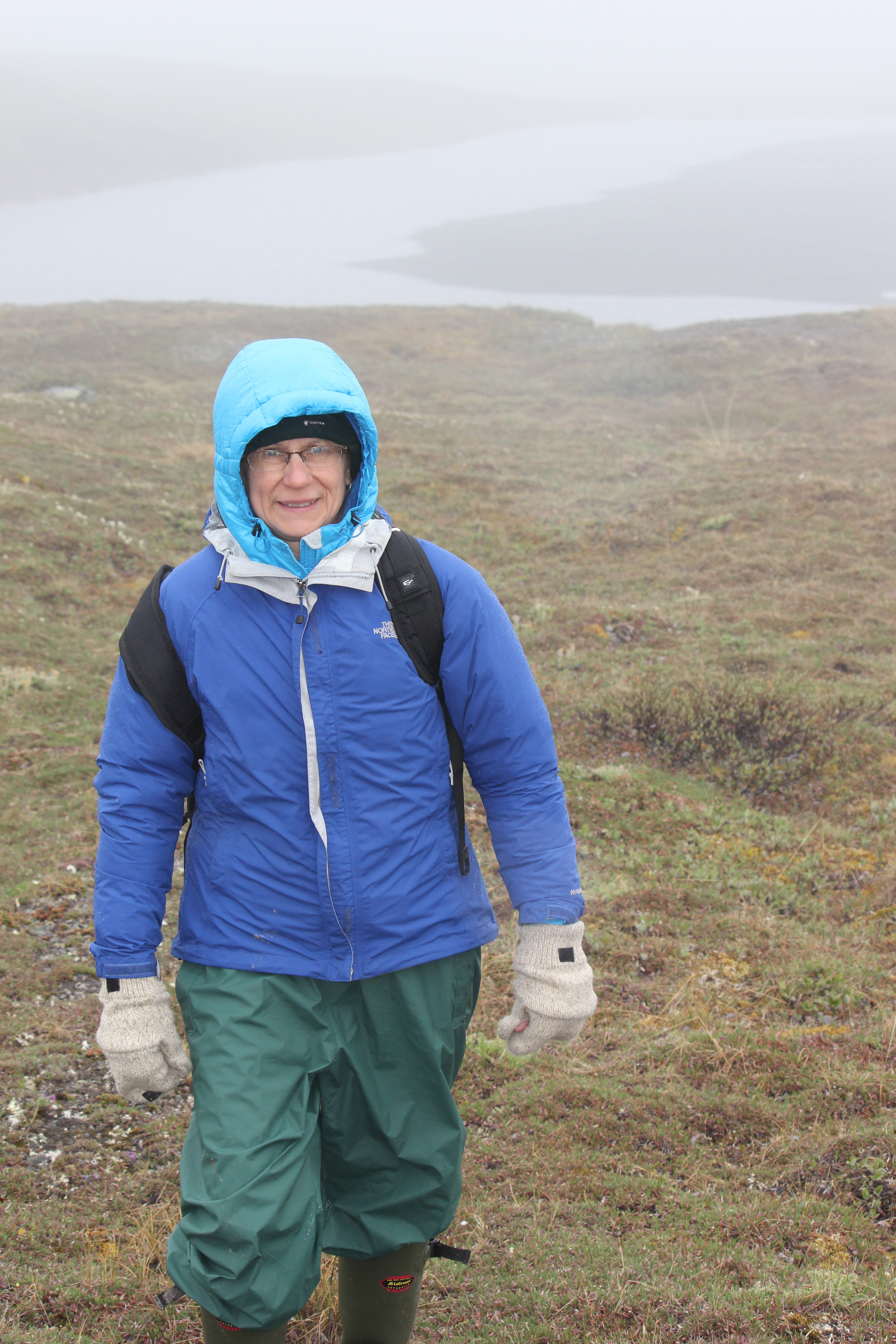 Regina Brinker takes a walk in foggy tundra. About 25 miles southwest of Toolik Lake, on the Sagavanirktok River, Alaska.