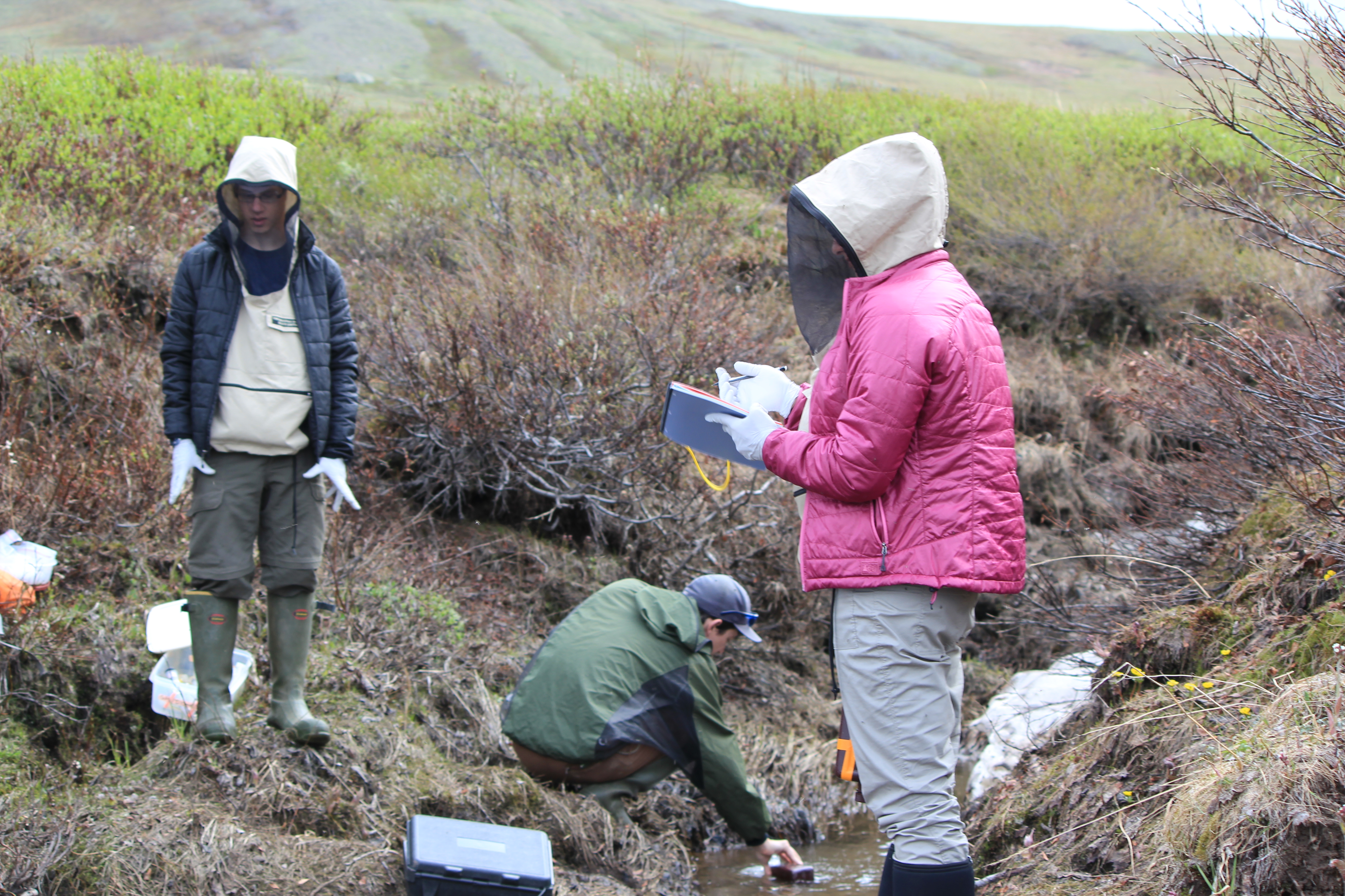 Chris, Jason Dobkowski, and Sarah Navlen wear mosquito jackets and work in the field. Toolik Field Station, Alaska.