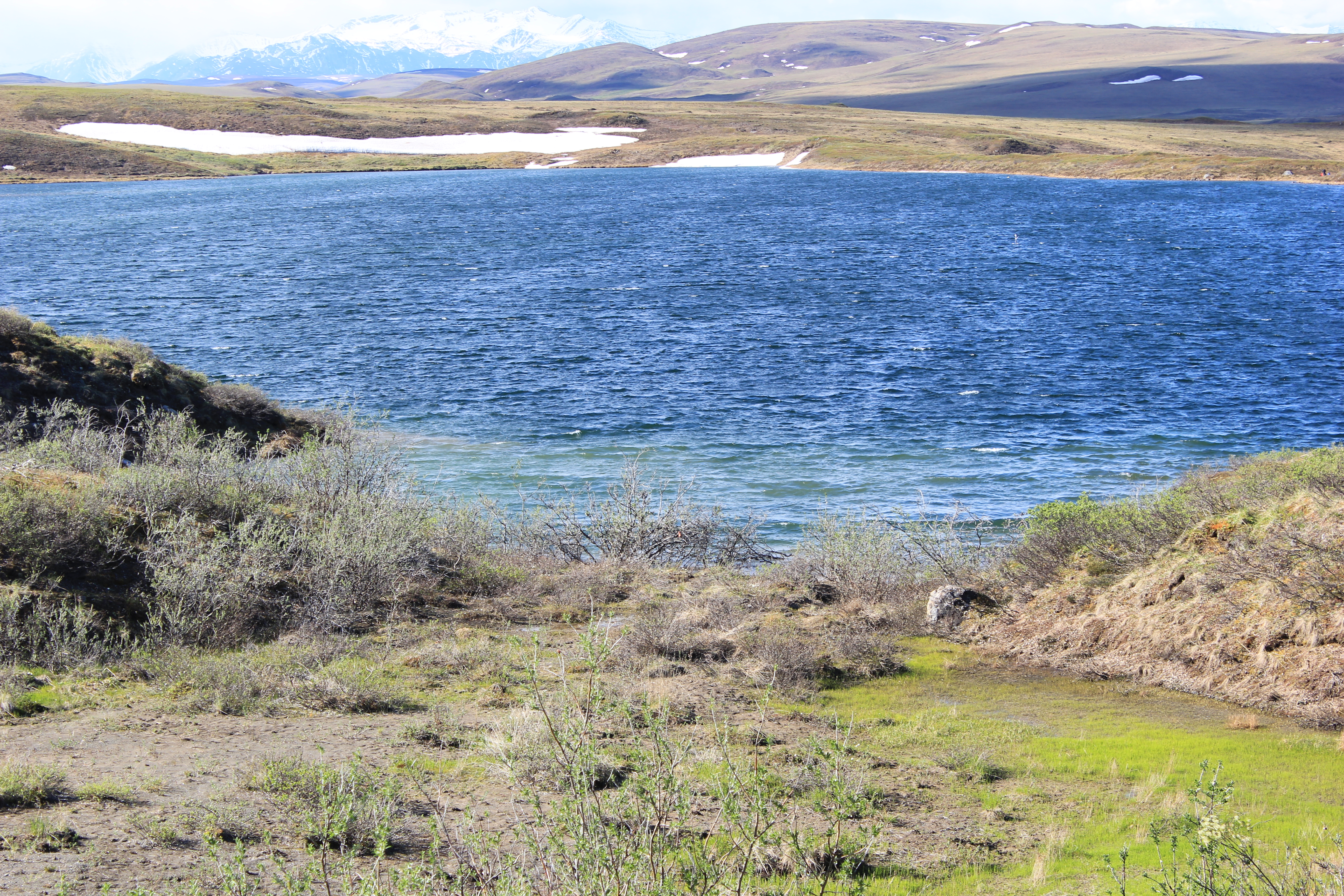A view downhill into the blue lake on this sunny day. Toolik Field Station, Alaska.