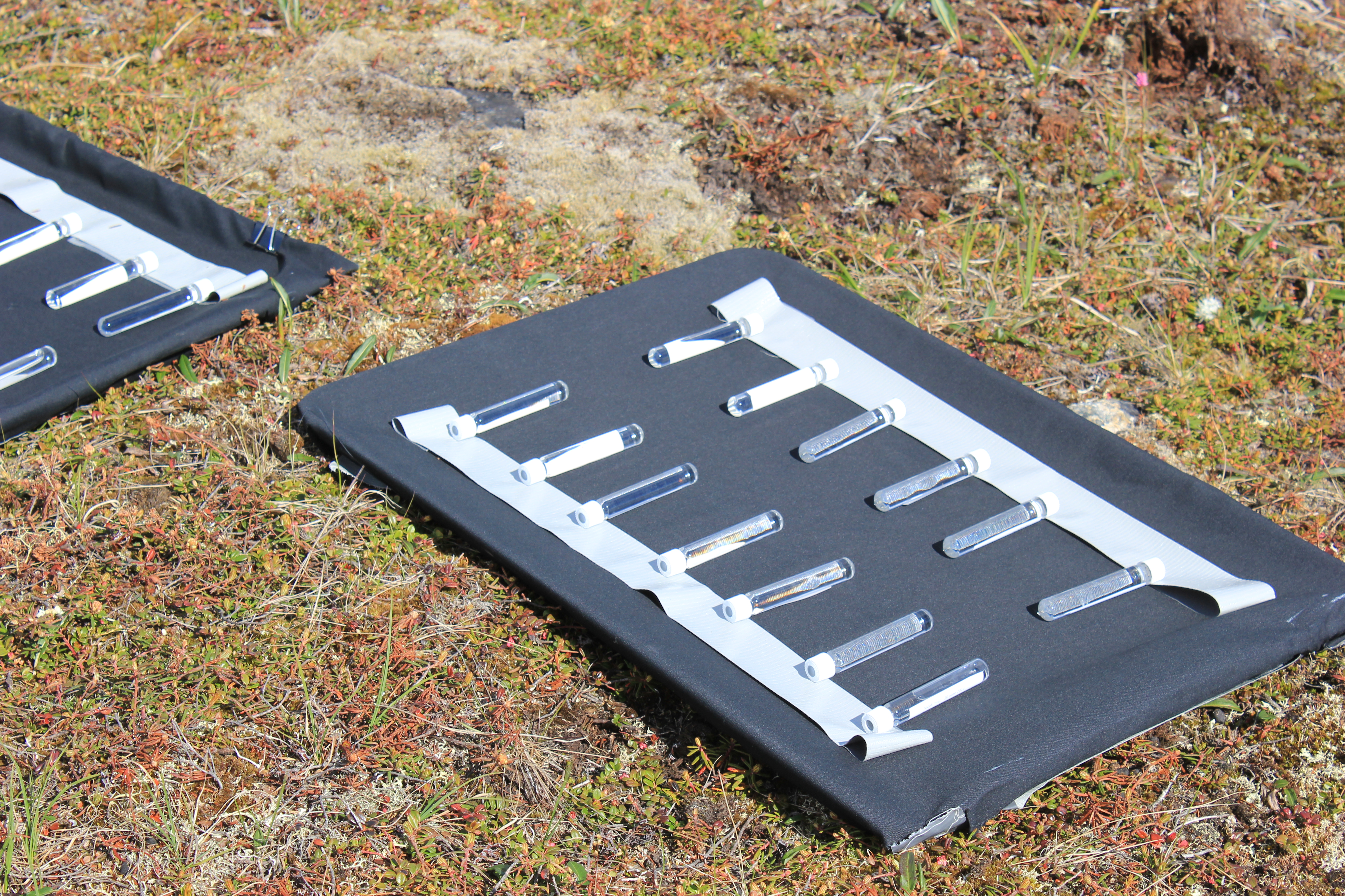 Rose Cory's experiment exposes water to sunlight. These vials rest on black trays to absorb the sun. Toolik Field Station, Alaska.