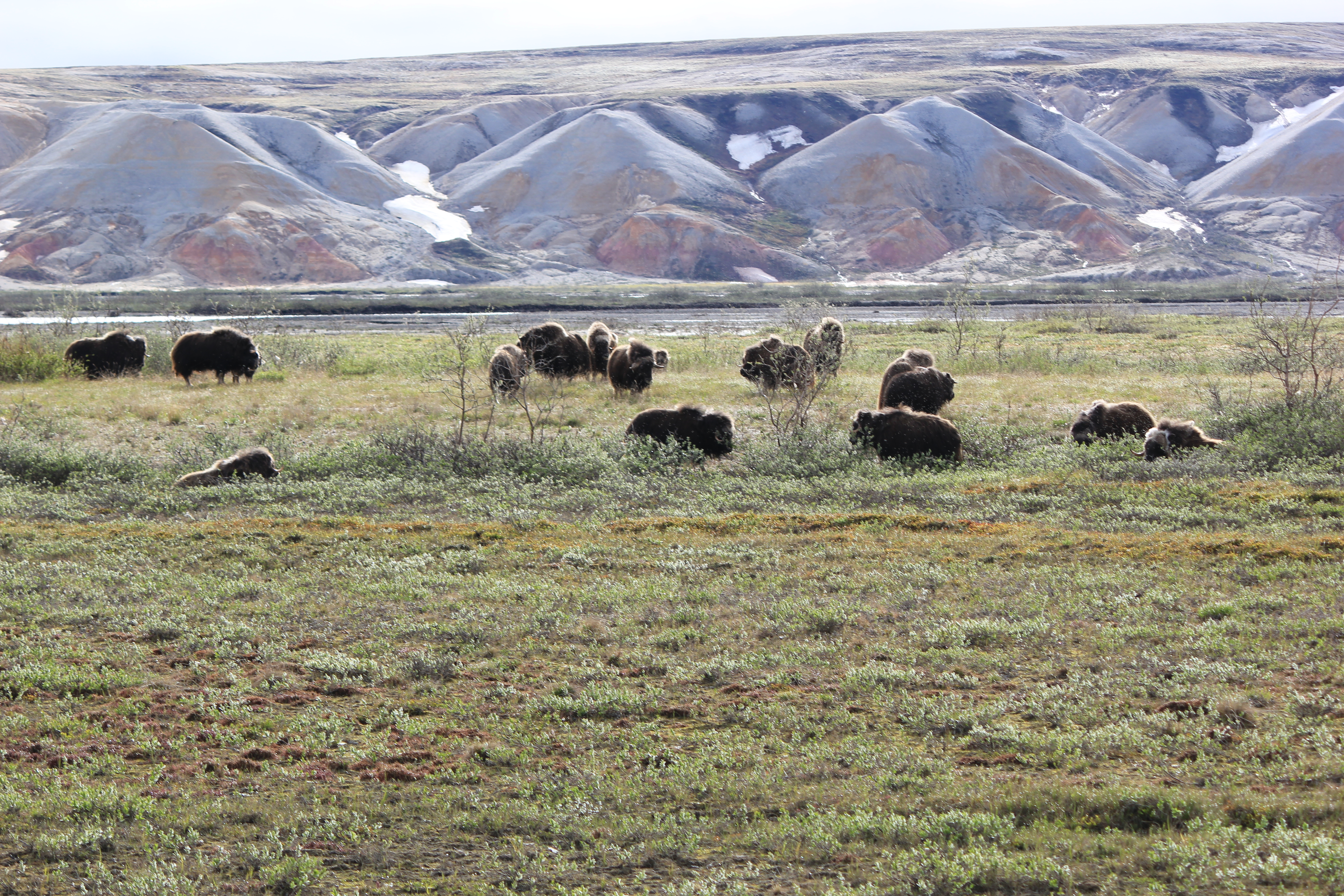 A group of muskox with bluffs in the background. North Slope, Alaska.