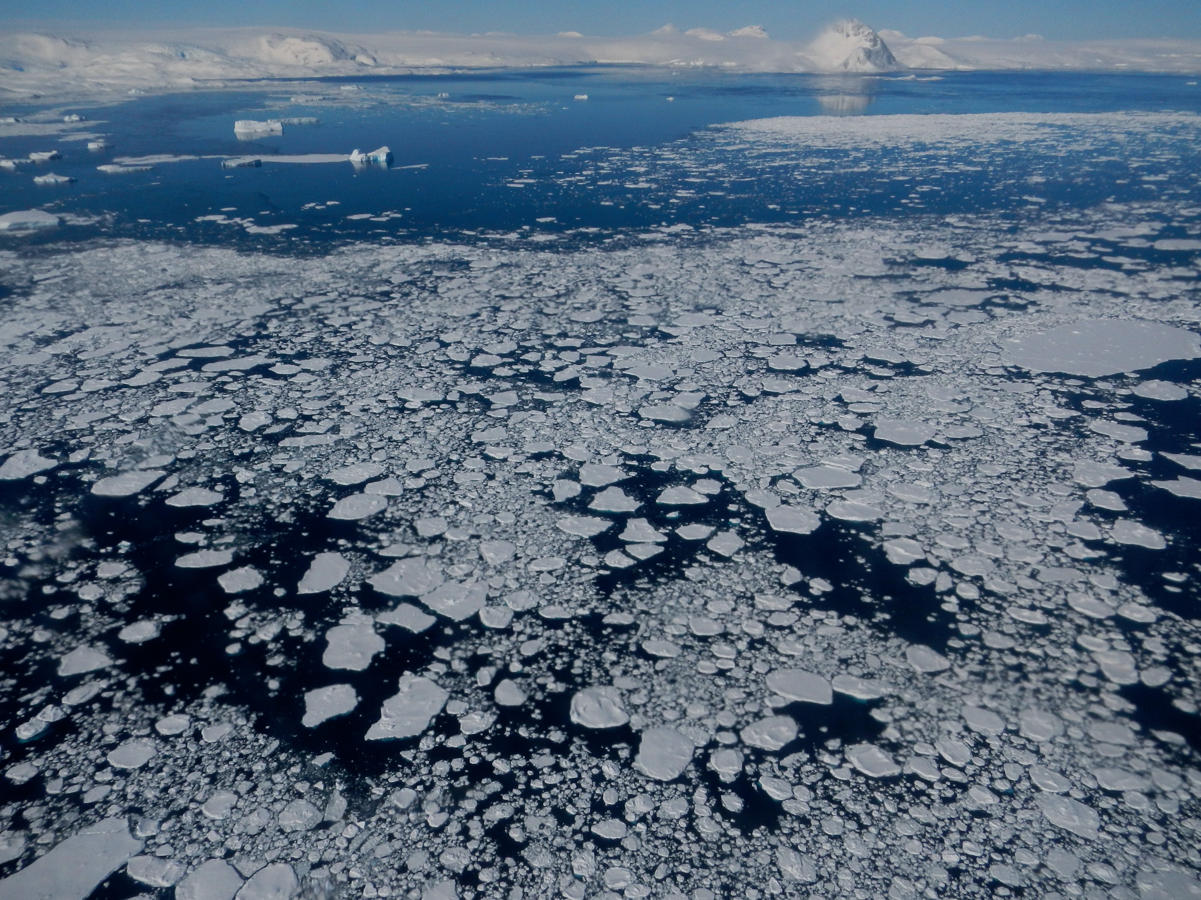 Broken sea ice and a few icebergs calved from glaciers in southeast Greenland.