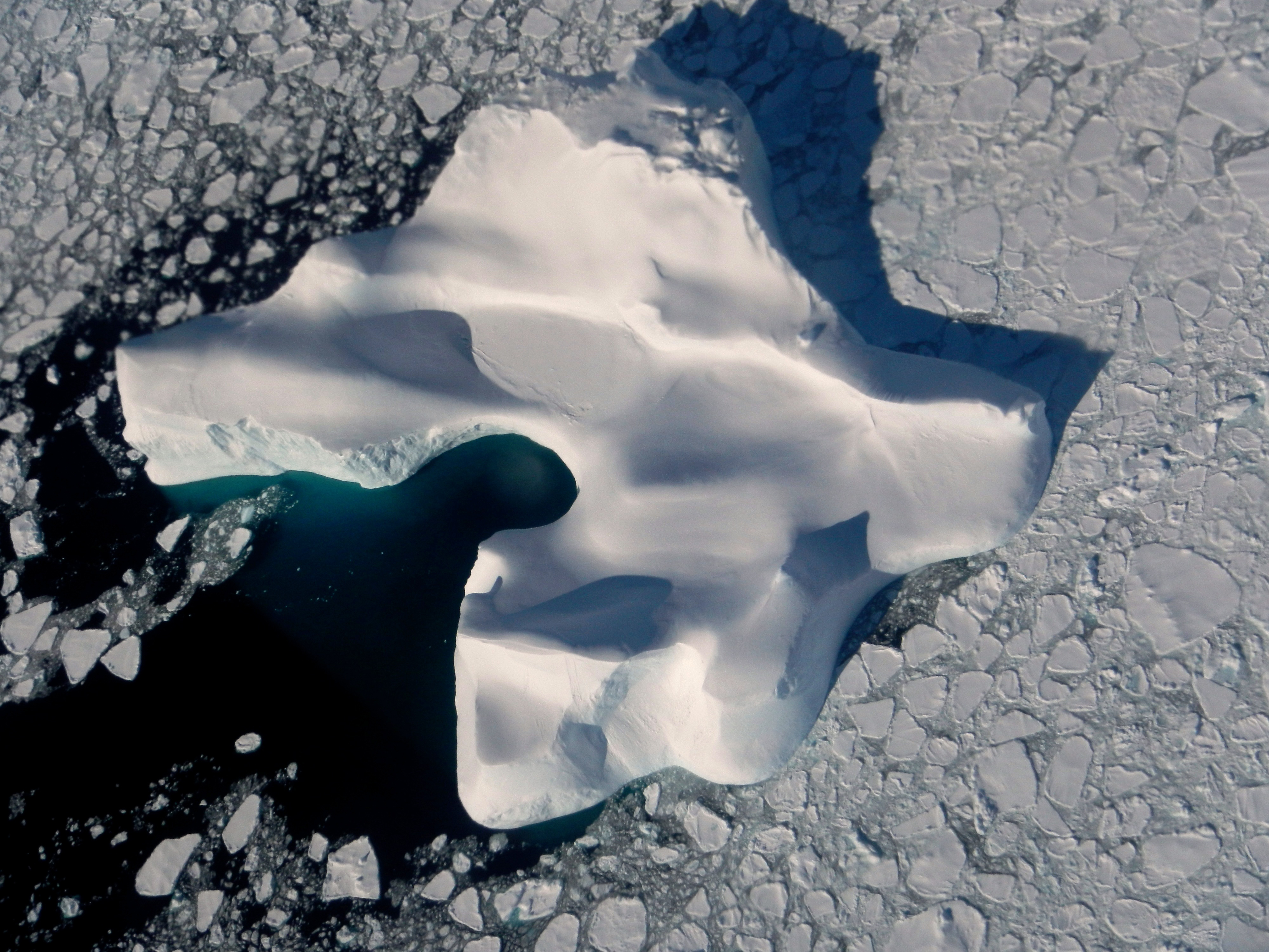 A top view of an unusually shaped iceberg in southeast Greenland.