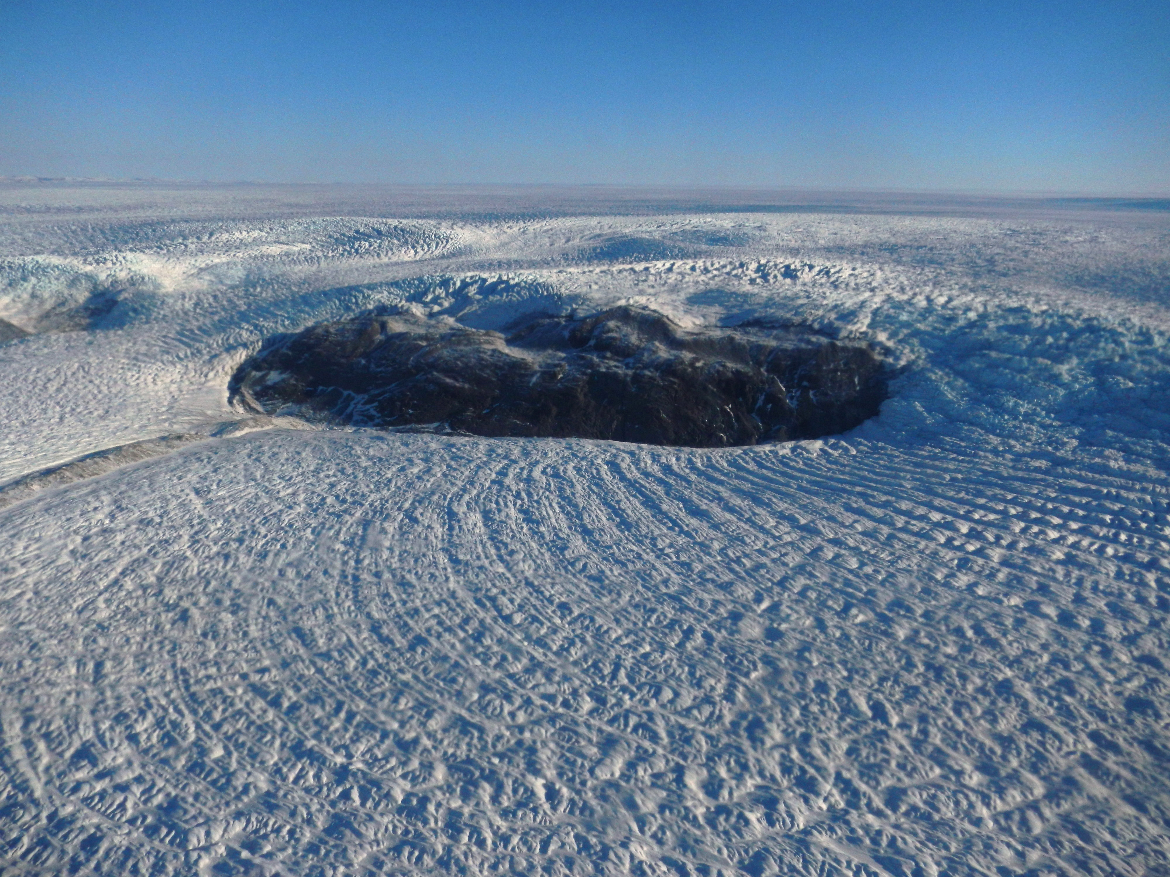 Glacial ice surrounds this mountain. Aboard the P-3 Orion flying over Greenland.