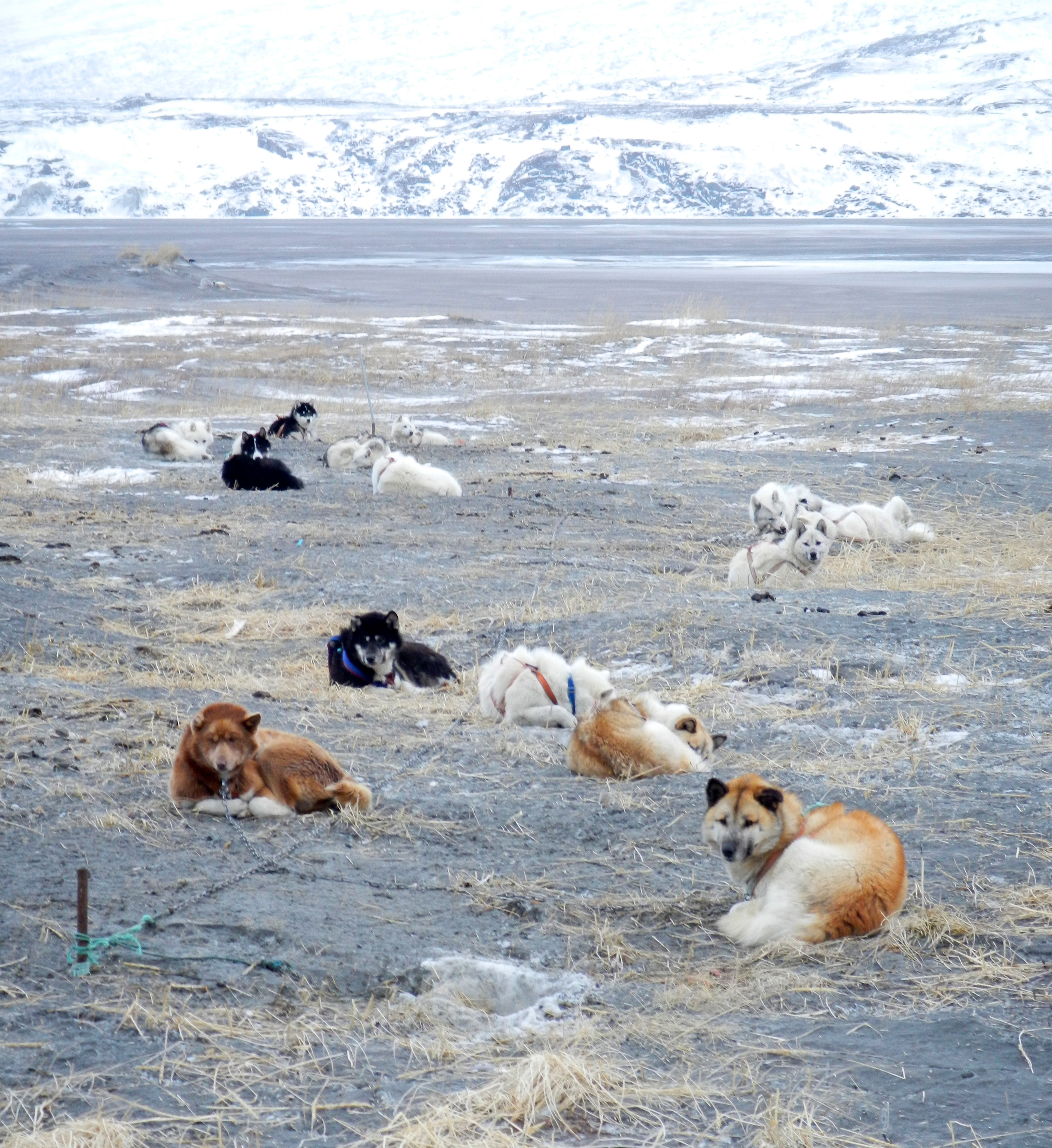 Sled dogs all lined out as a team. Kangerlussuaq, Greenland.