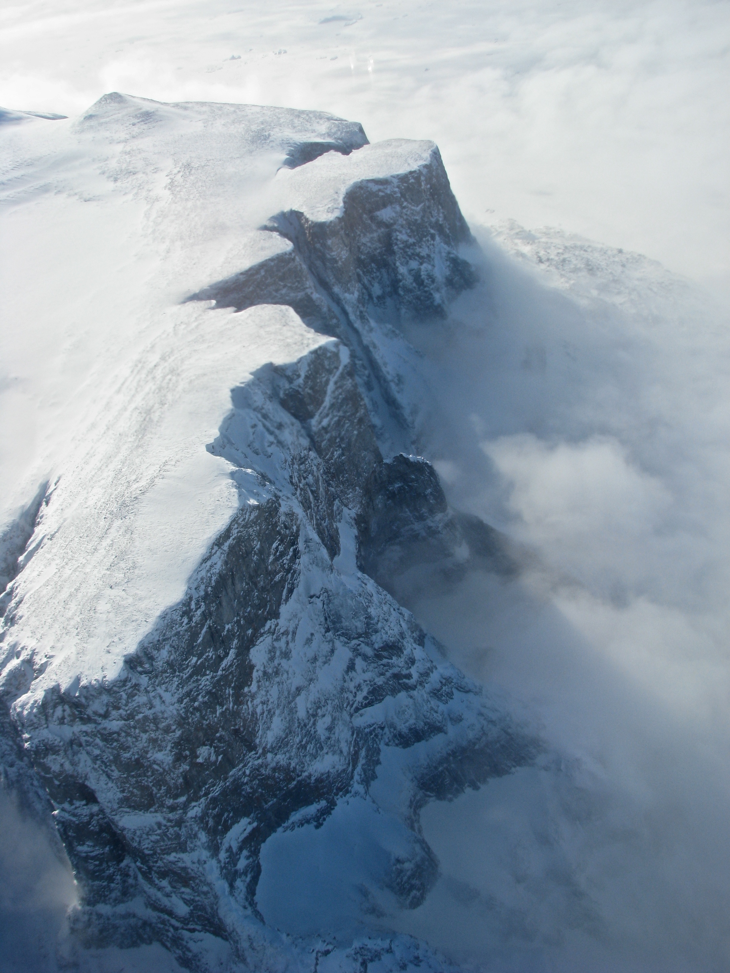 The cliff edge of a plateau. Aboard the P-3 Orion, flying over Greenland.