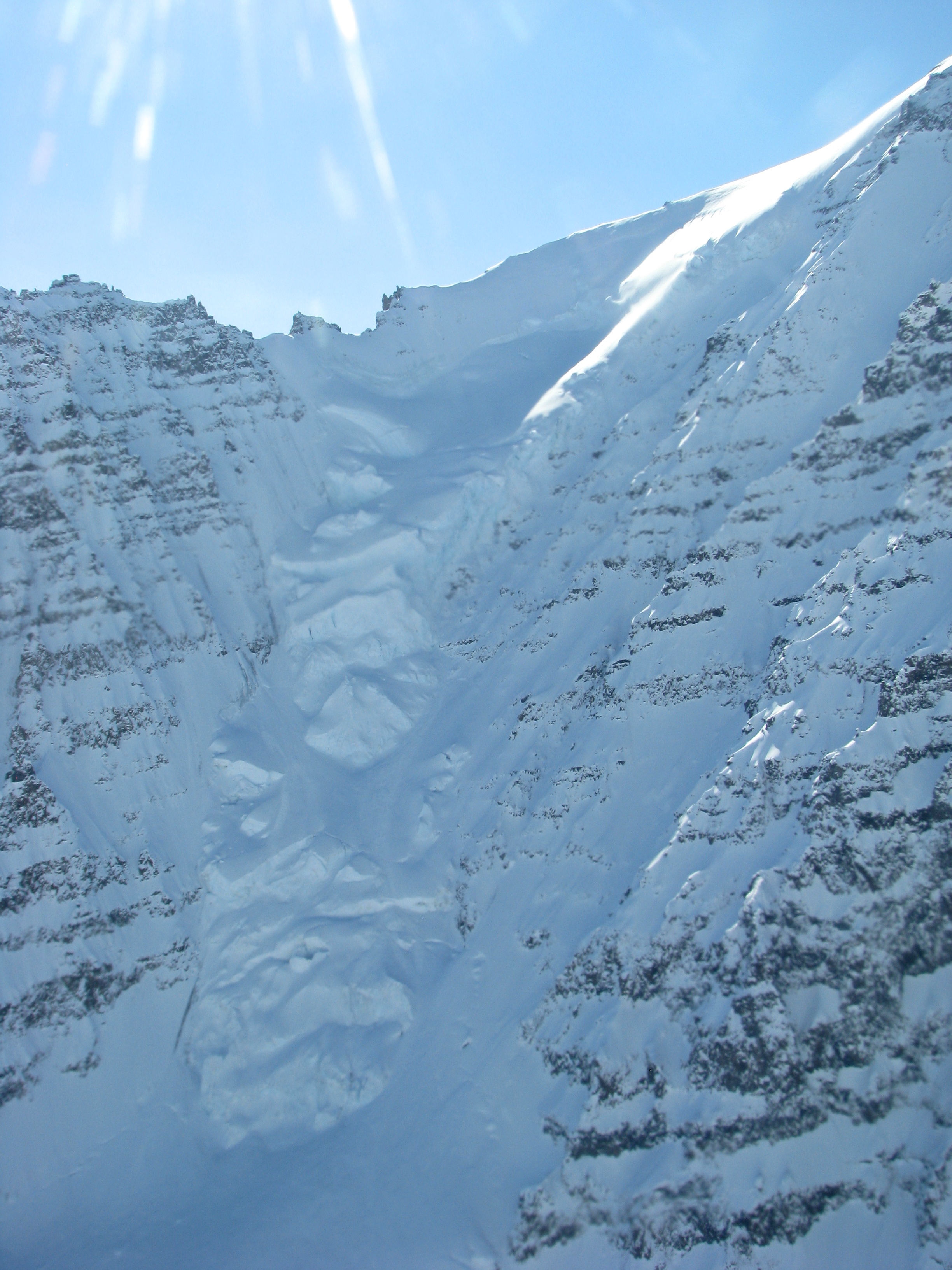 A glacier tumbles over and down a mountain in Eastern Greenland.