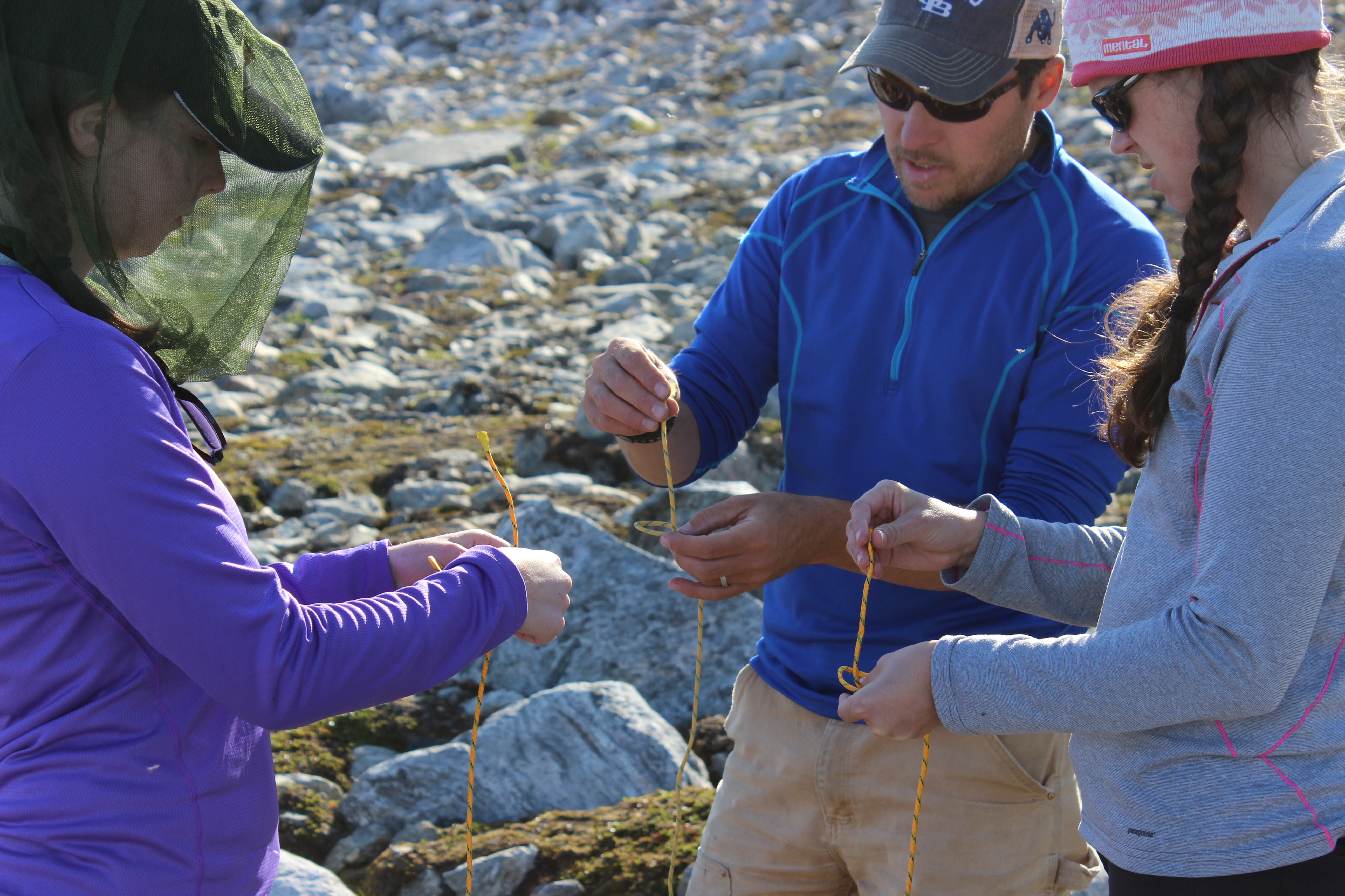 Dr. Jason Briner gives Avy Schweinsberg and Alia Lesnek a knot tying lesson. Base Camp 1, Nunatarssuaq, Greenland.