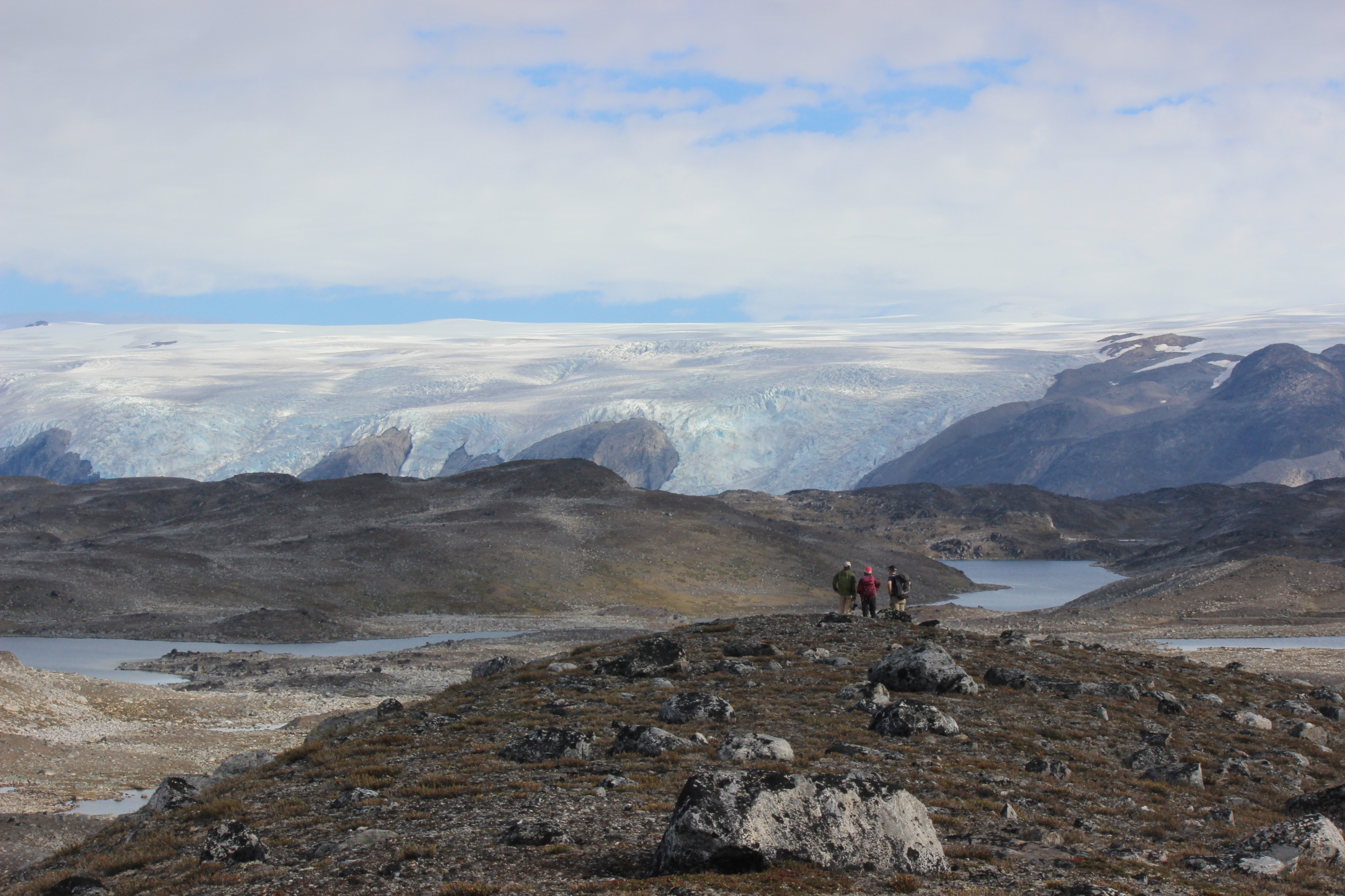 Dr. Jason Briner, Nat Lifton, and Avy Schweinsberg study the landscape and try to determine the geological timeline of events. Sukkertoppen Ice Cap, Greenland.