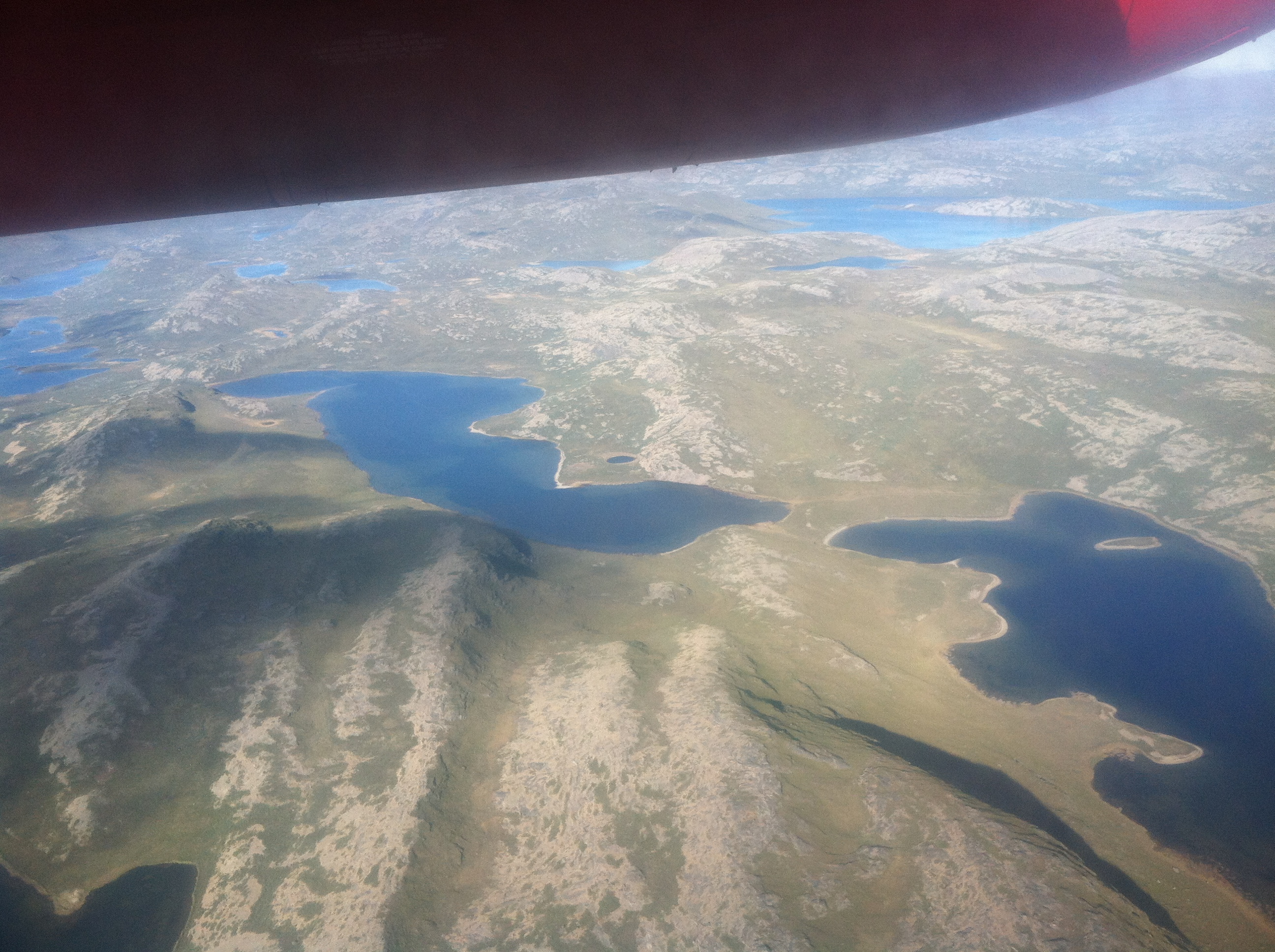 Lake color varies on whether or not it is snow melt or glacial melt and the size and type of particles suspended in the water column. Aboard a flight between Ilulissat to Kangerlussauq, Greenland.