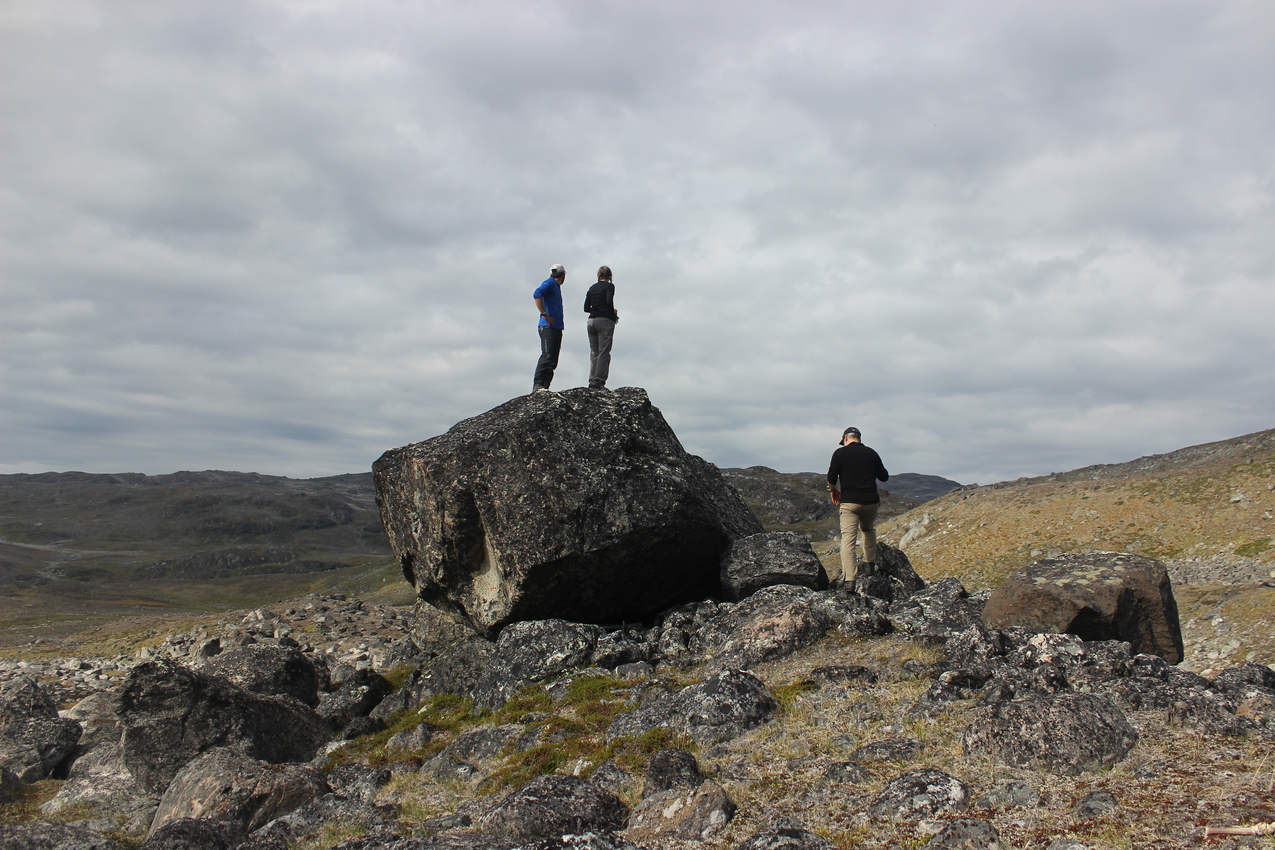 A few team members add perspective to the size of the erratics. Base Camp 2 – Lil' Nug, Greenland.