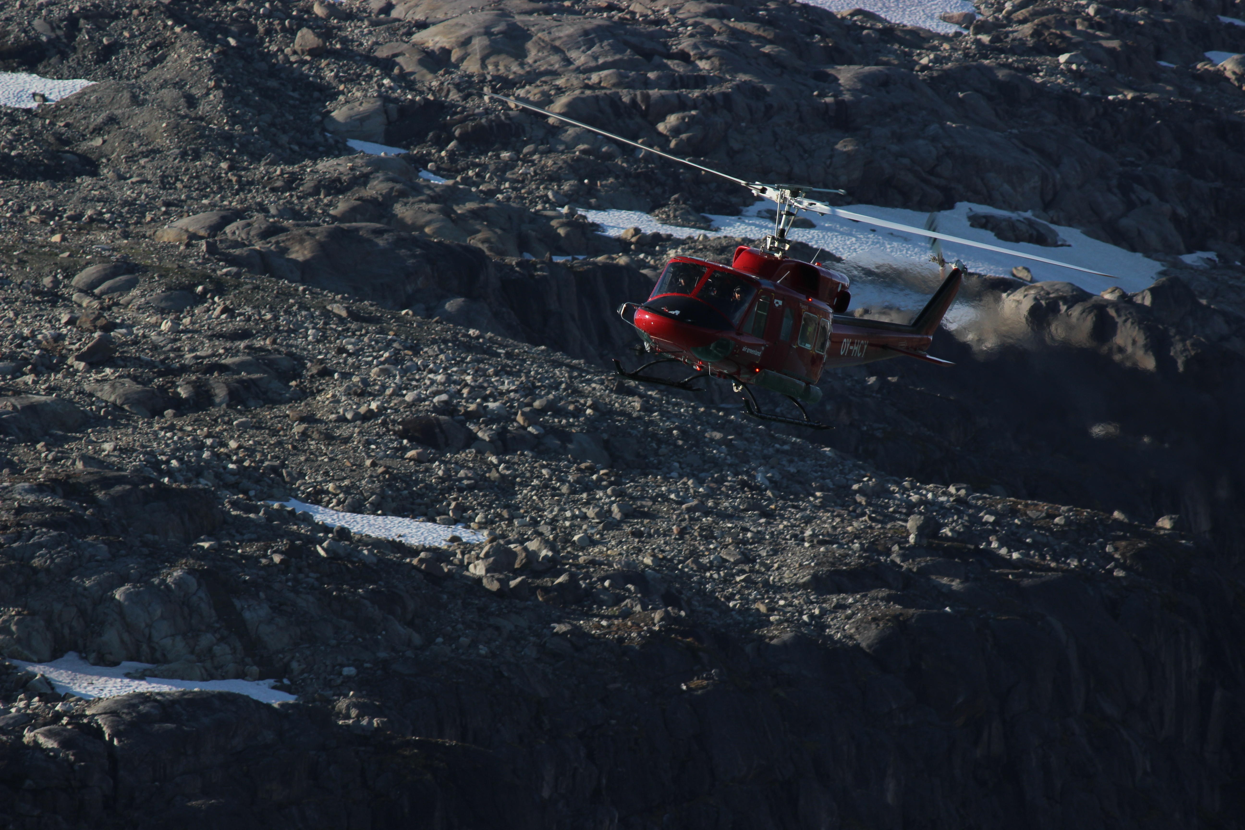 The helicopter comes in for a landing. It is the team's ride back to civilization. Sukkertoppen Ice Cap, Greenland.