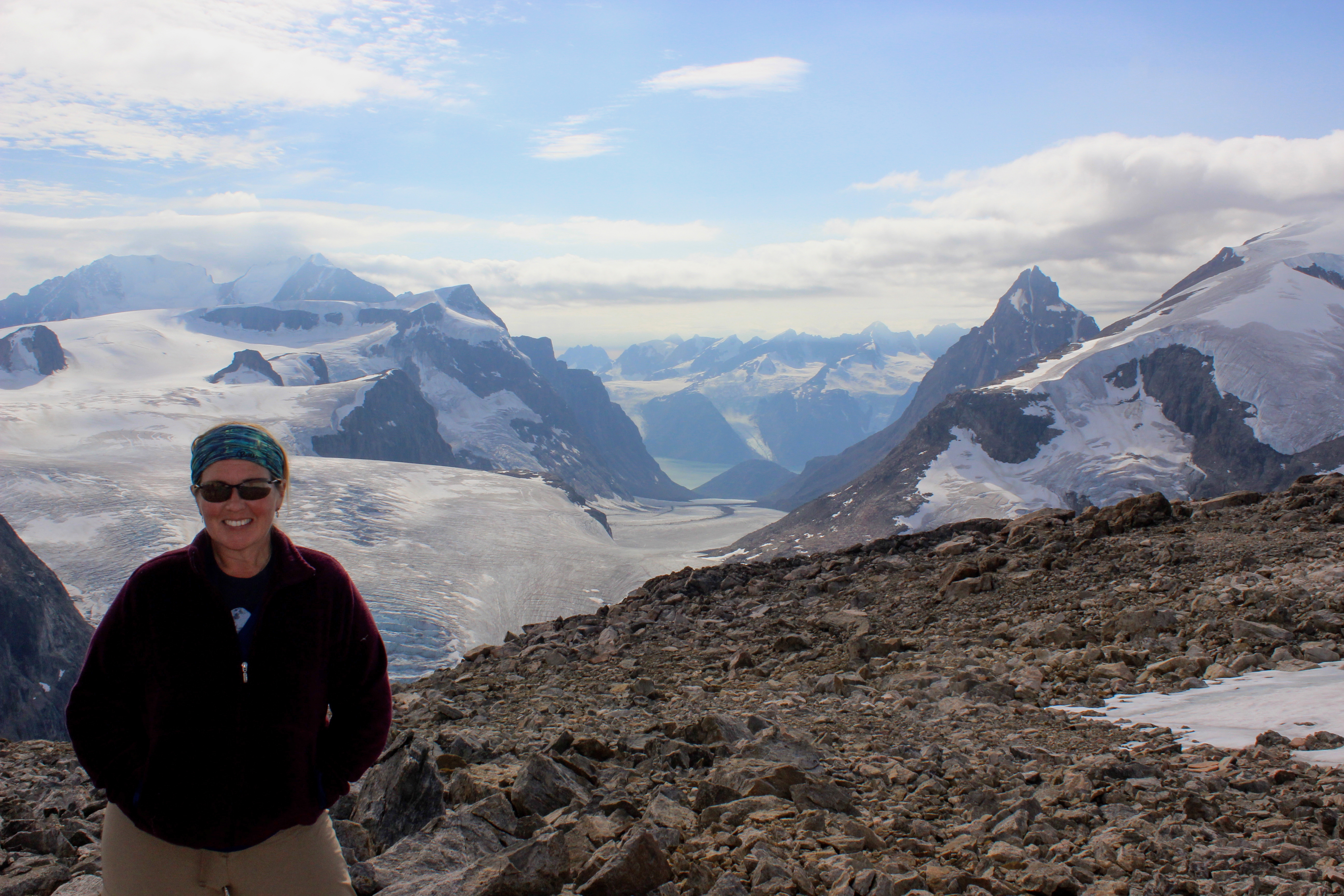 Tina Ciarametaro stands in front of the Sukkertoppen Ice Cap, Greenland.