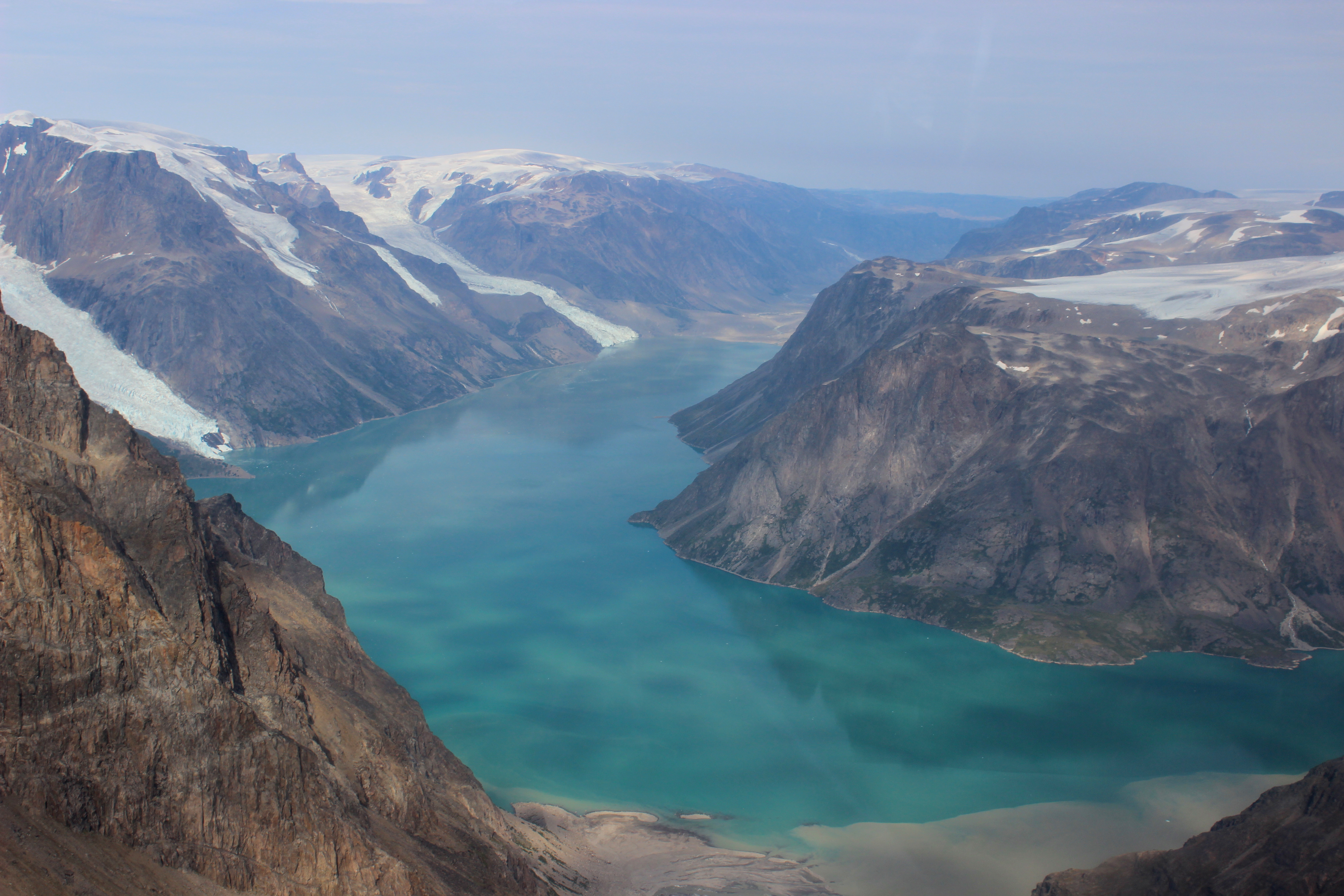An aerial view of a fjord valley near Sukkertoppen Ice Cap, Greenland.