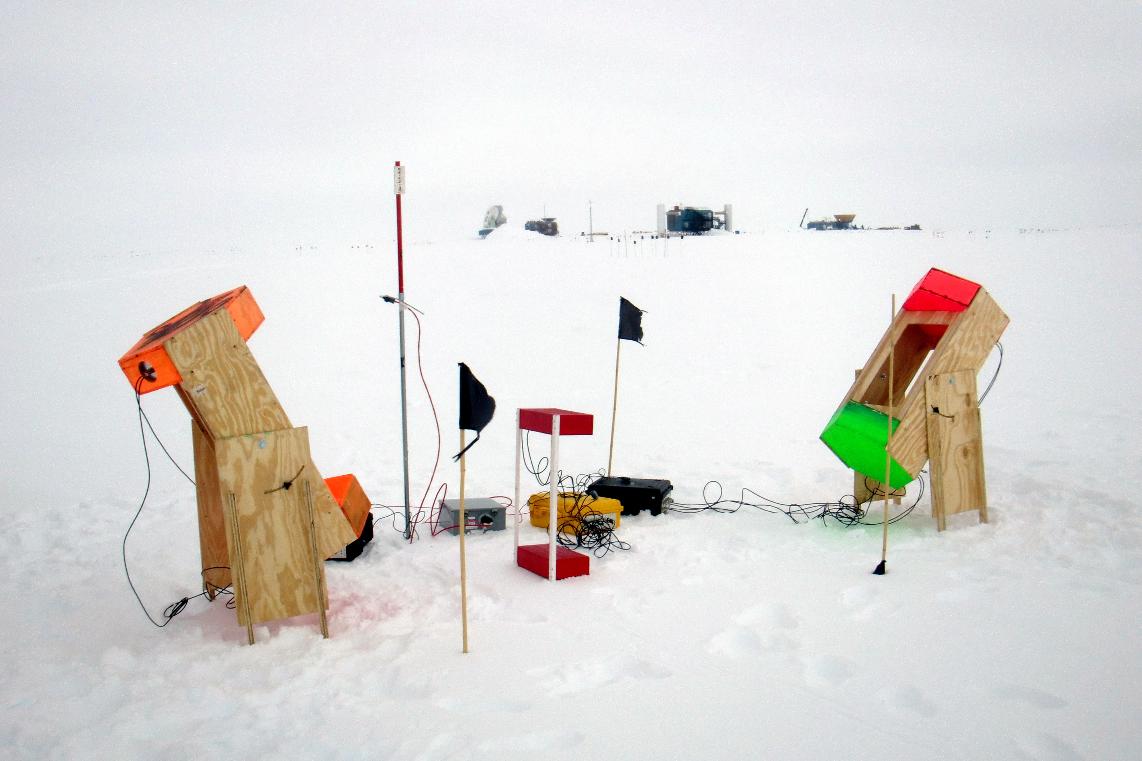 Cosmic ray sensors with the IceCube Laboratory far away in the background. Amundsen-Scott South Pole Station, Antarctica.
