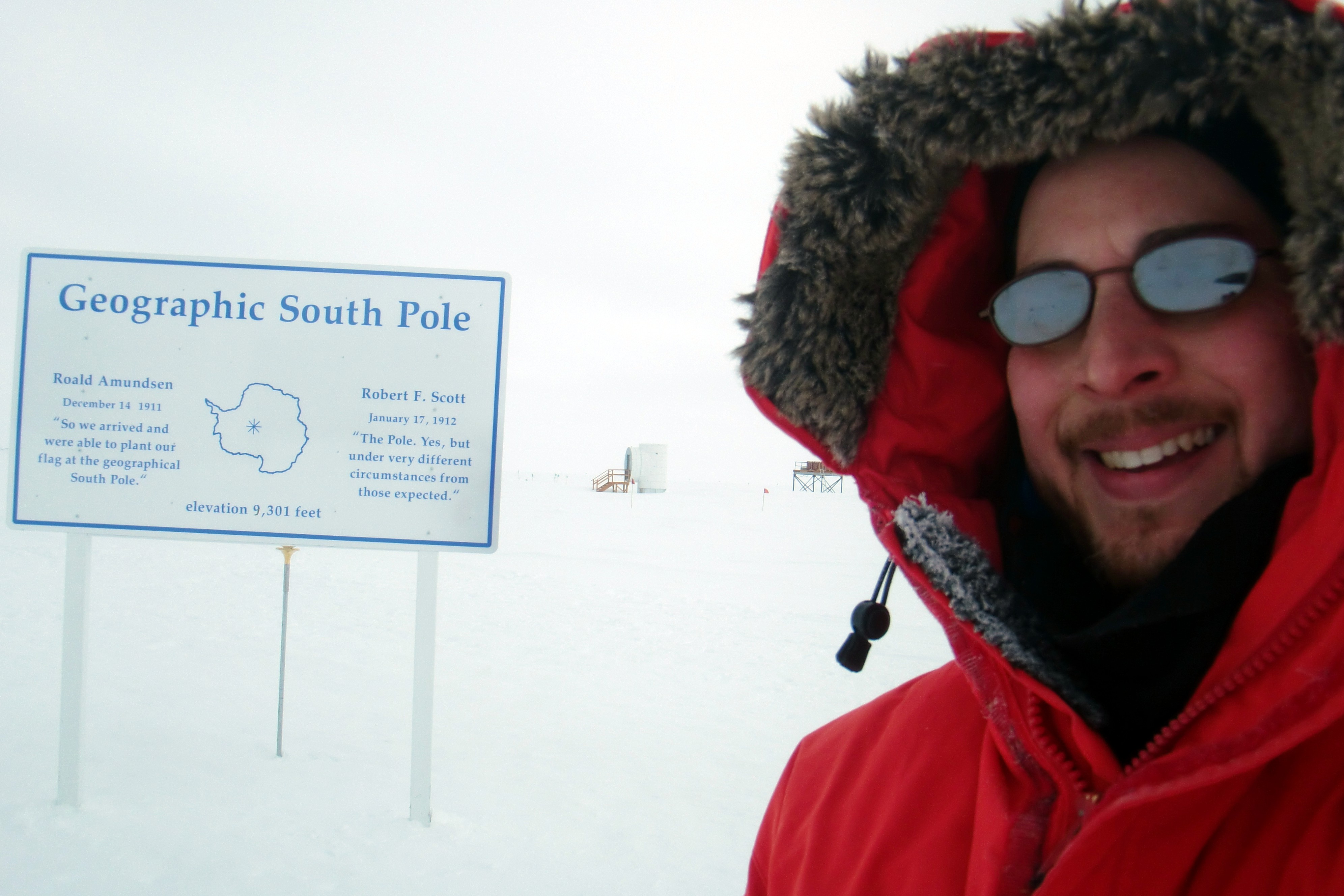 Armando Caussade's selfie photograph with the sign at the geographic South Pole. Amundsen-Scott South Pole Station, Antarctica.