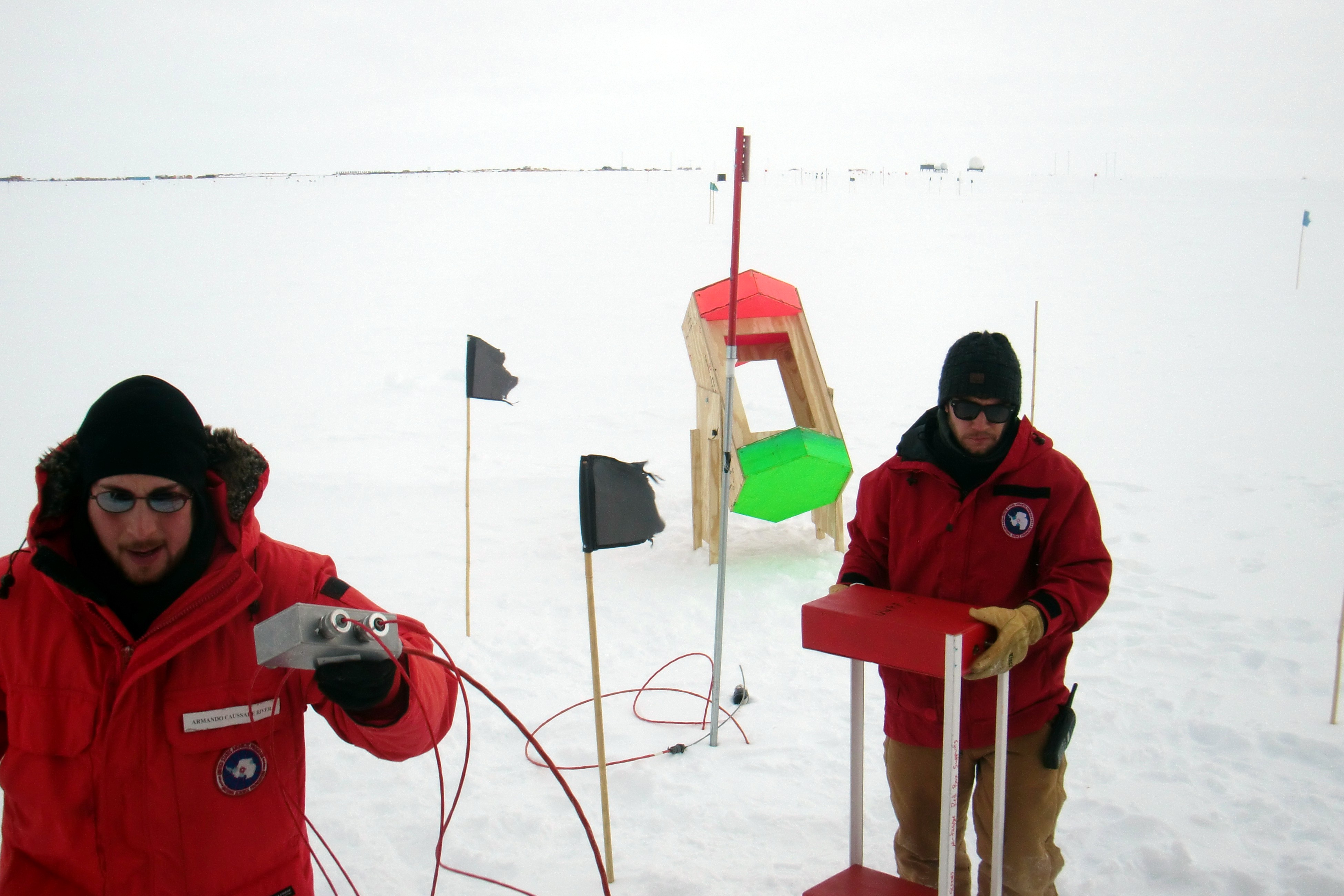Armando Caussade holds cables and Sam De Ridder works on a sensor. Amundsen-Scott South Pole Station, Antarctica.