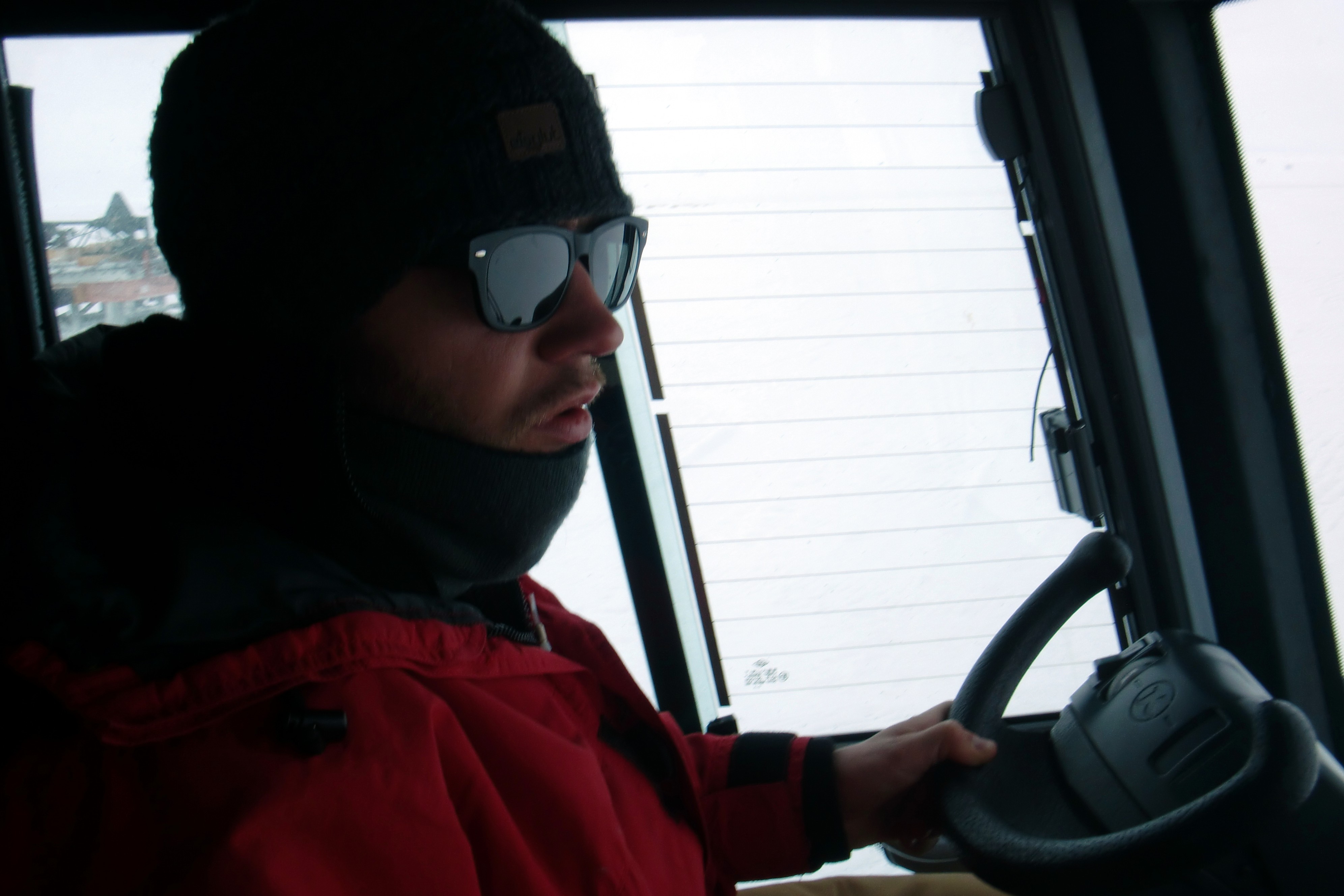Sam De Ridder drives the PistenBully snowmobile. The team drove to 38 different IceTop tank locations. Amundsen-Scott South Pole Station, Antarctica.