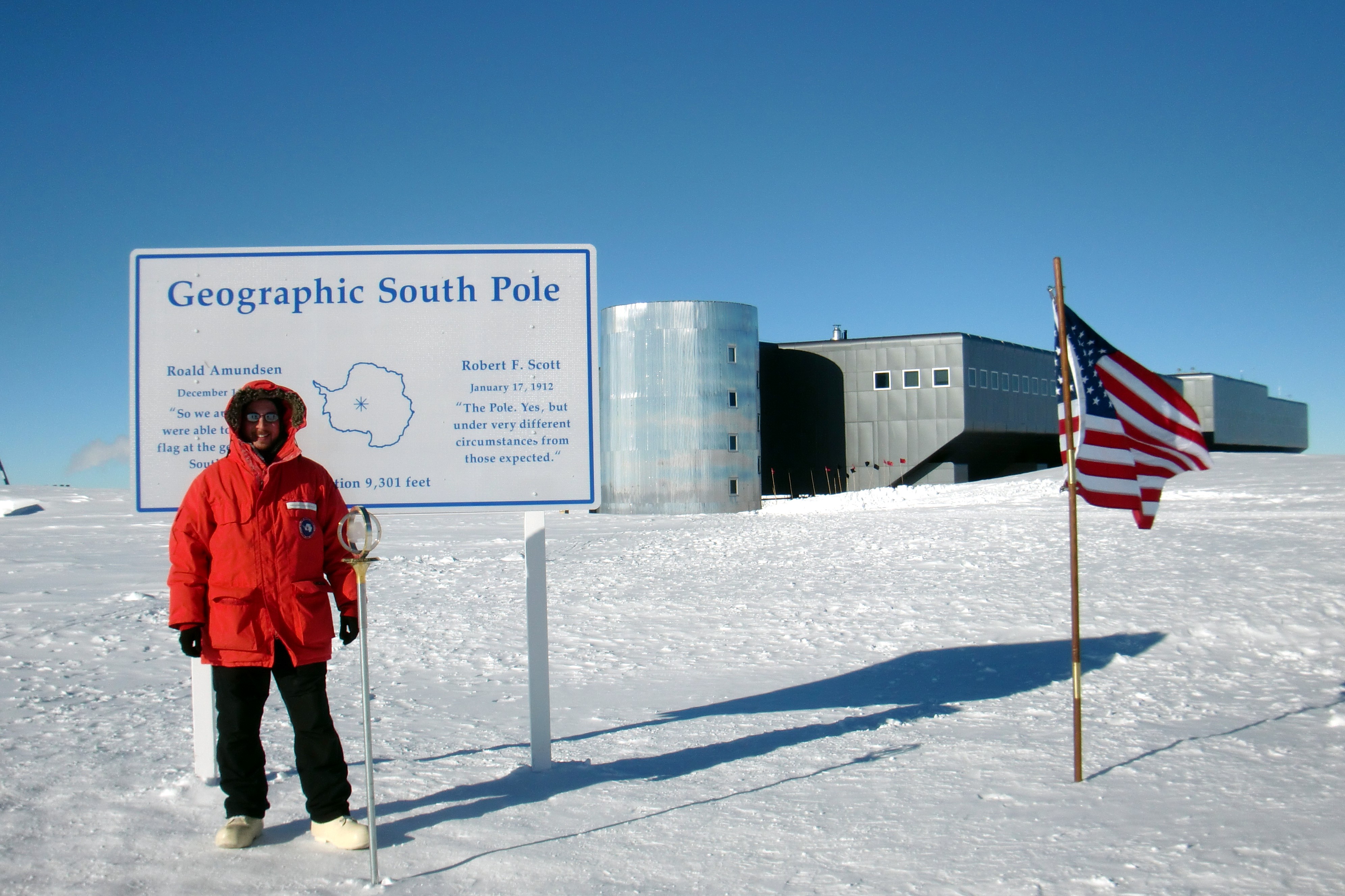 Armando Caussade at the geographic South Pole. Amundsen-Scott South Pole Station, Antarctica.