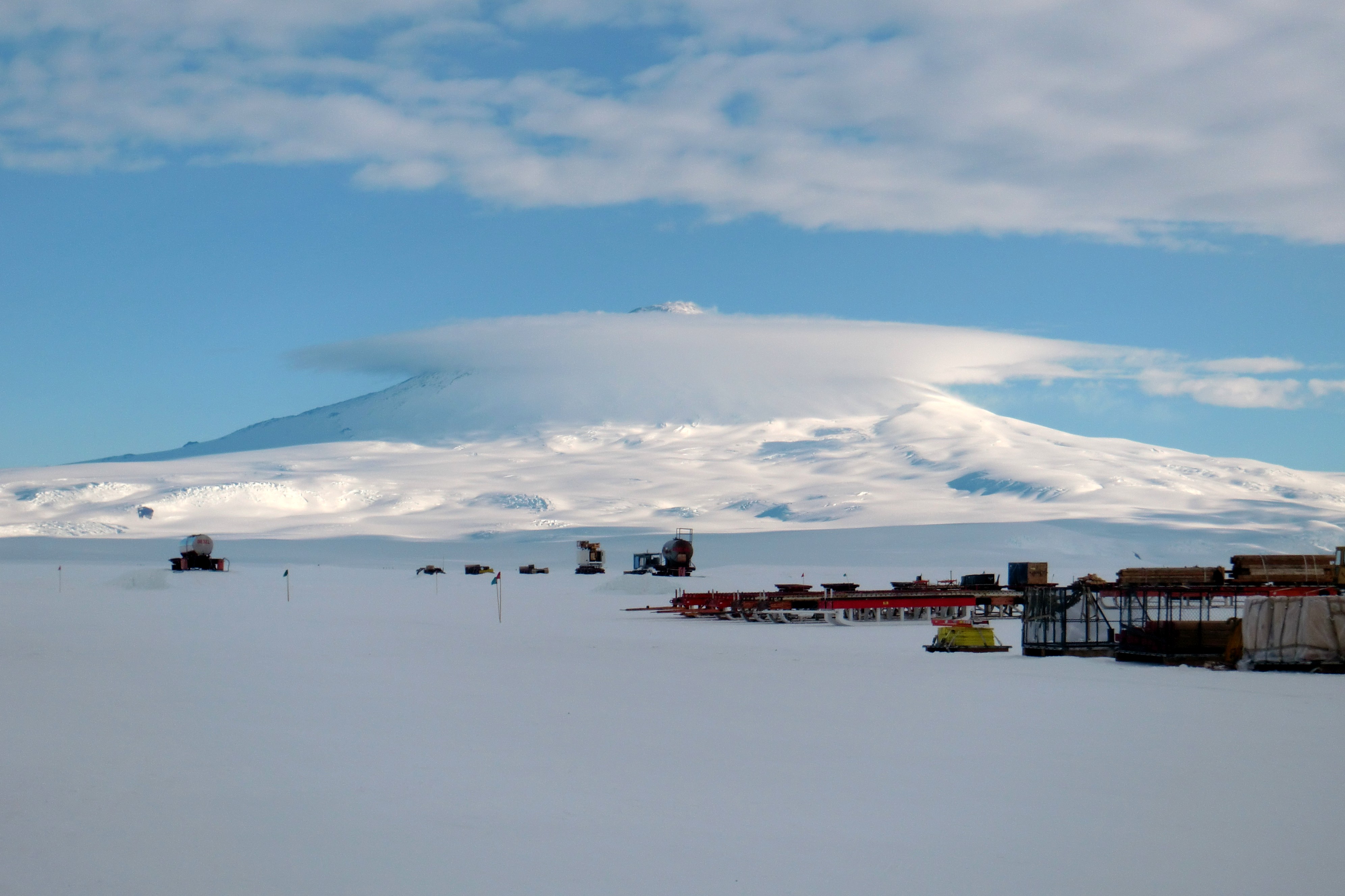 One last view of Mount Erebus. A lenticular cloud can be seen above the volcano. Williams Field, near McMurdo Station, Antarctica.