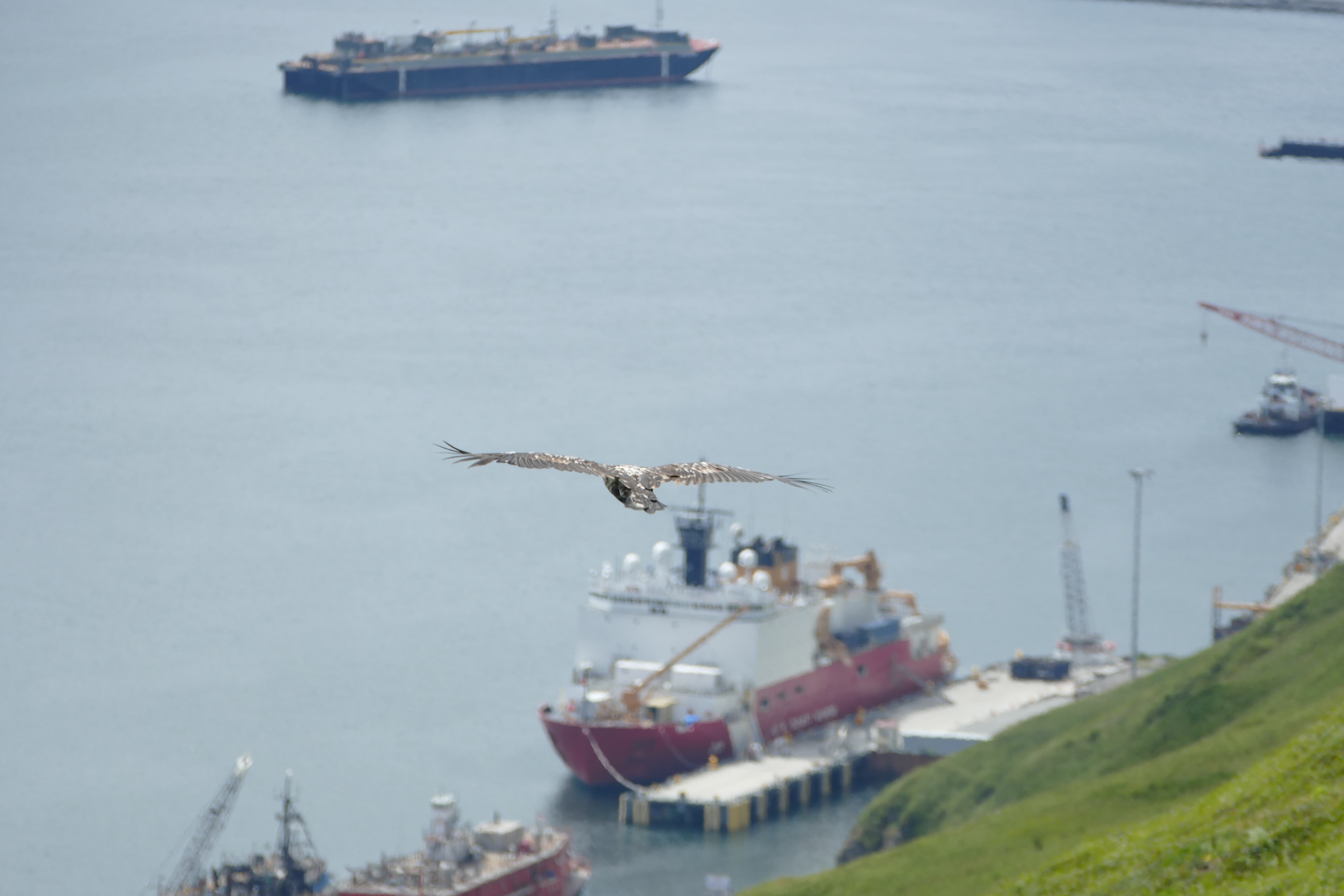Bill Schmoker: "On the hike back down Mt. Ballyhoo I was in the unusual position of watching a young Bald Eagle soaring, from above. For a moment it crossed in front of the distant USCGC Healy." Amaknak Island, Alaska.
