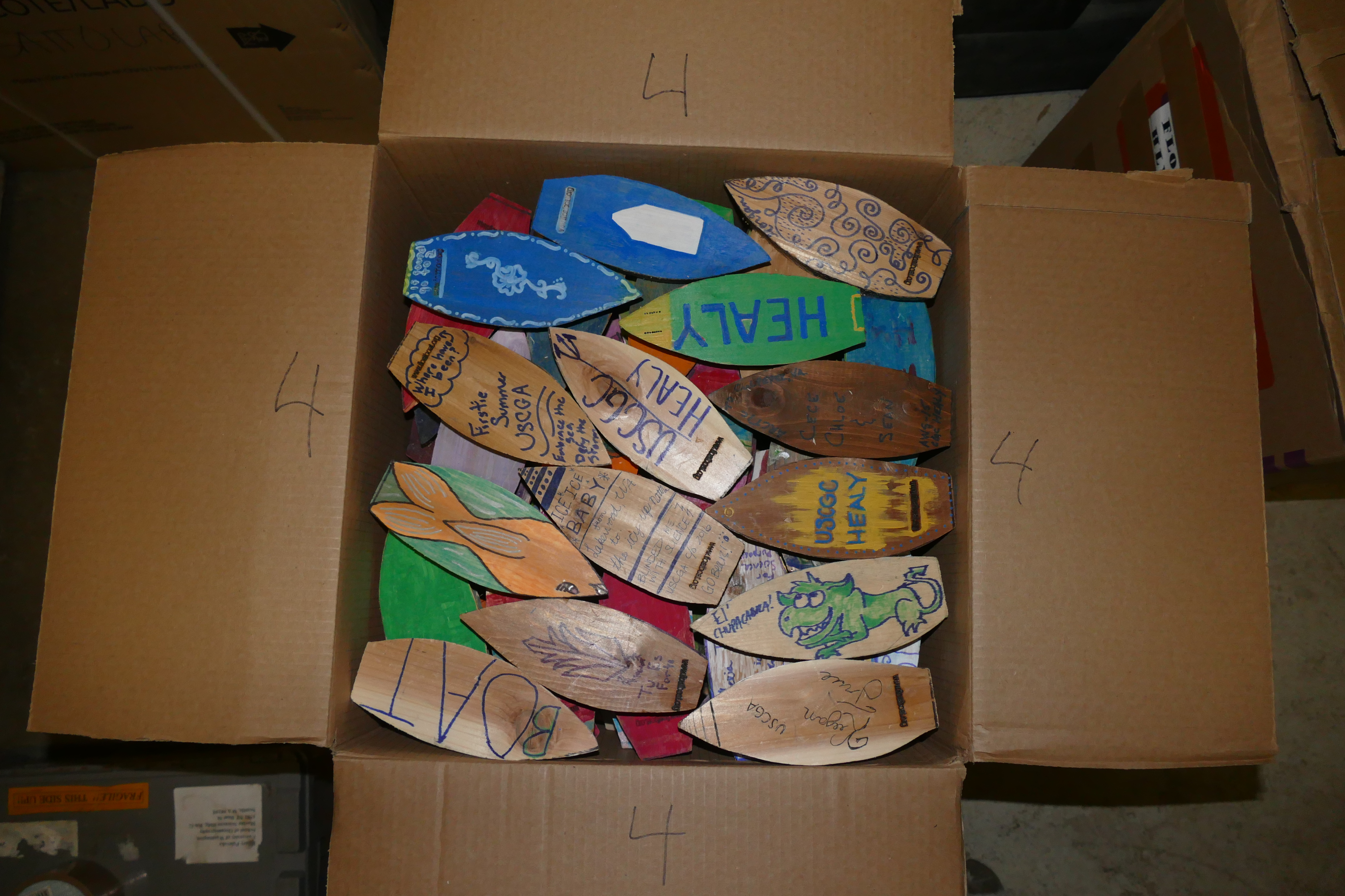 Decorated wooden boats are boxed up for deployment on an ice floe as part of the Float Your Boat project. Aboard the USCGC Healy in the Makarov Basin. 86.70°, -149.48°.