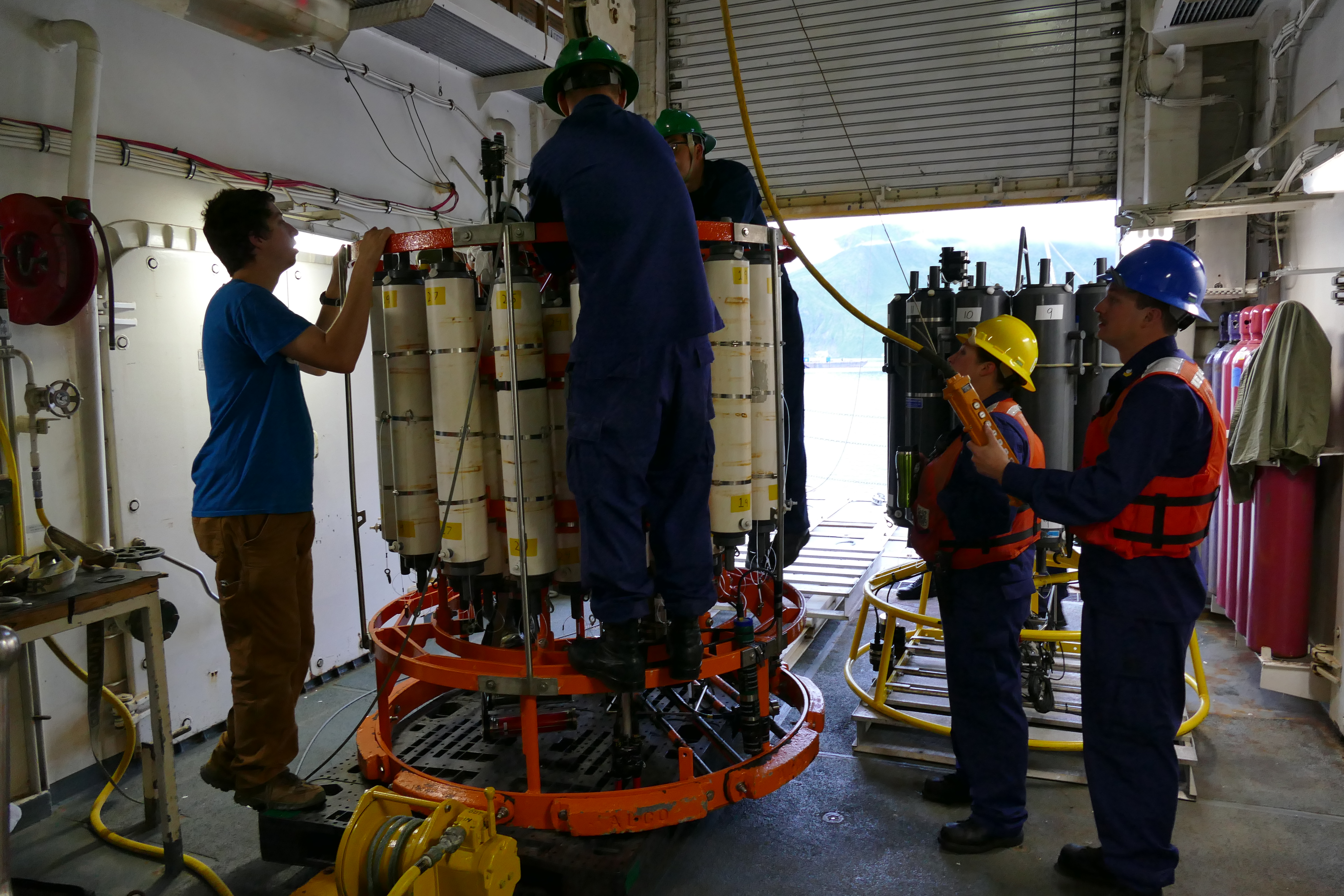 A team of scientists and Coast Guard crew get the 36-bottle CTD (conductivity, temperature, and depth instrument) ready for a test cast in the starboard staging bay. Each of these bottles can recover 10 liters of sea water at a chosen depth, and the CTD electronically returns data on salinity, temperature, and depth. Dutch Harbor, Alaska.
