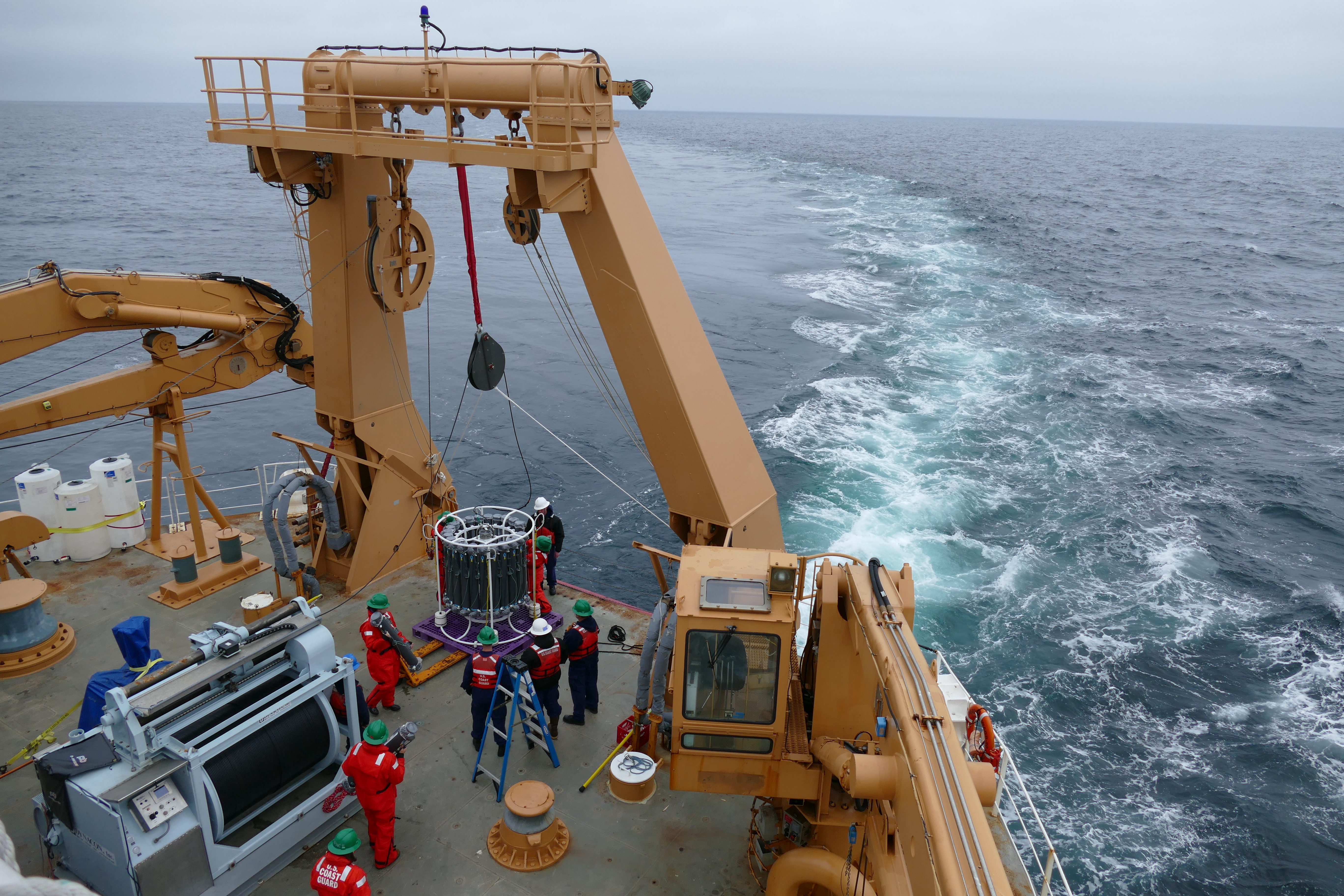 The GEOTRACES CTD (conductivity, temperature, and depth instrument) is being set up on the fantail deck. Aboard the USCGC Healy near Dutch Harbor, Alaska.