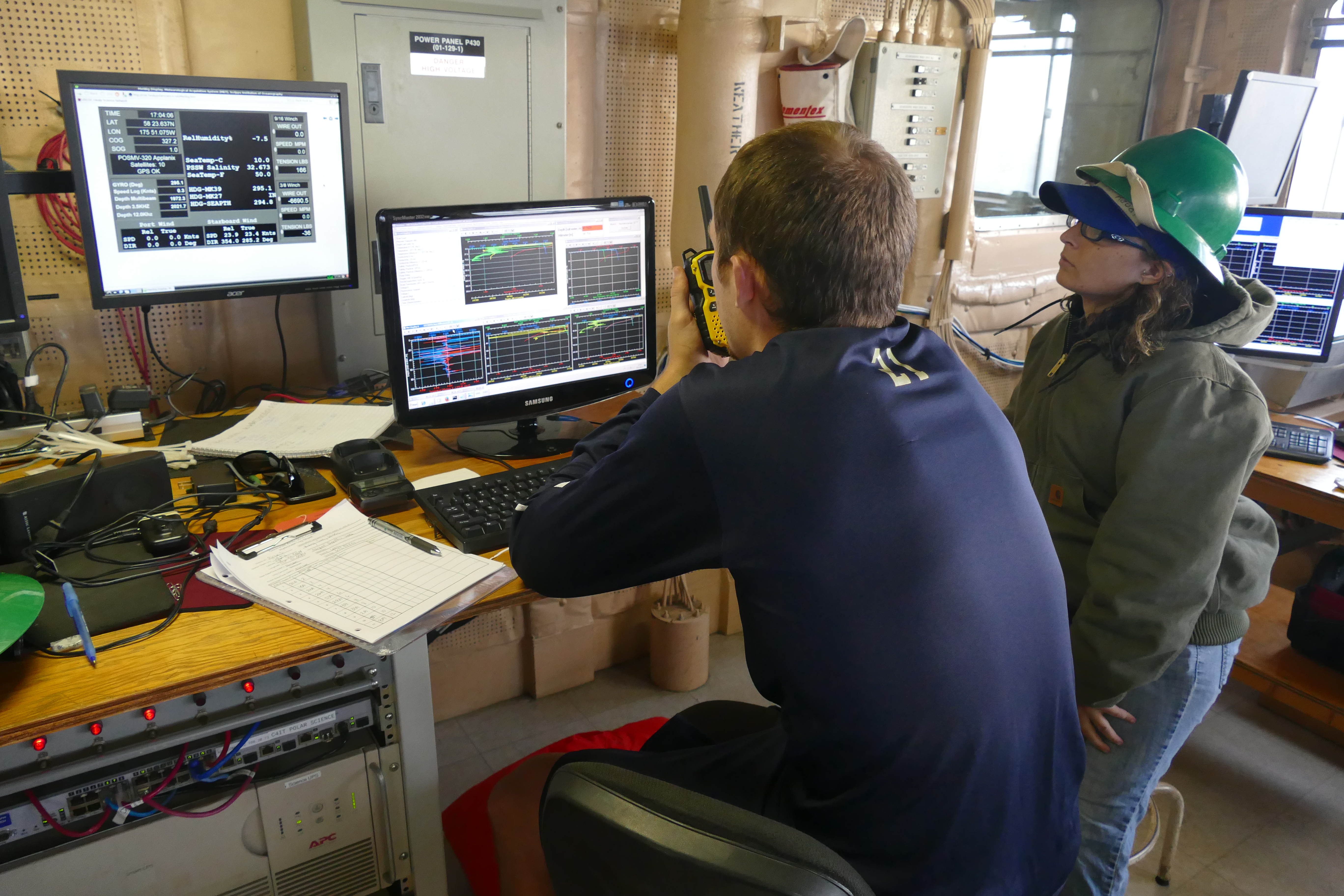 Kyle McQuiggan and Gabrielle Weiss operate the CTD (conductivity, temperature, and depth instrument) data console. Aboard the USCGC Healy in the Bering Sea. 58.40°, -175.89°.