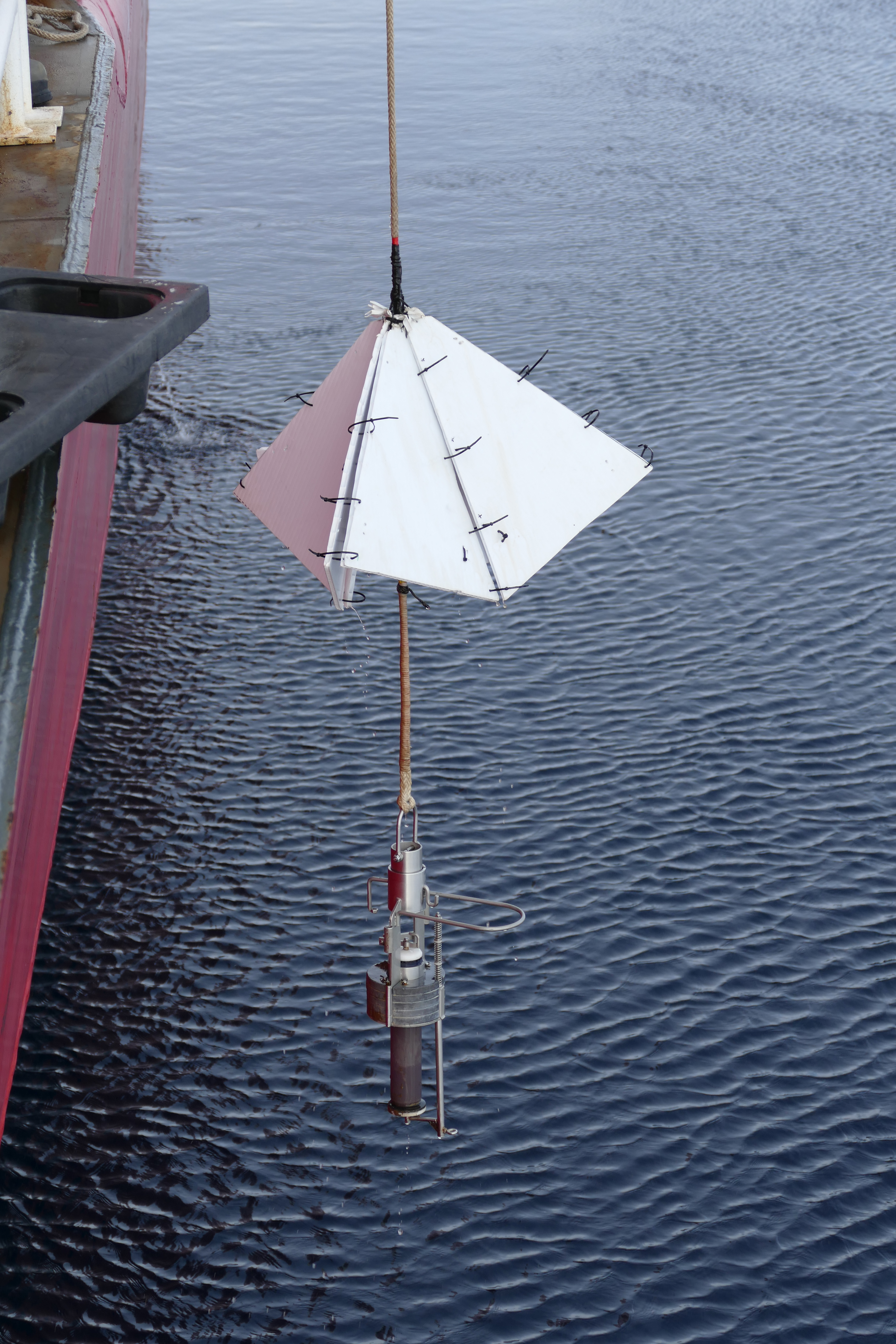The Mono-Core sampler returns to deck from ~2200 meters deep. Note the so-called 'cone of silence' rigged above the sampler to deflect sonar signals from the rosette altimeter. Aboard the USCGC Healy at the Mendelev Rise in the Arctic Ocean. 80.02°, -175.40°.