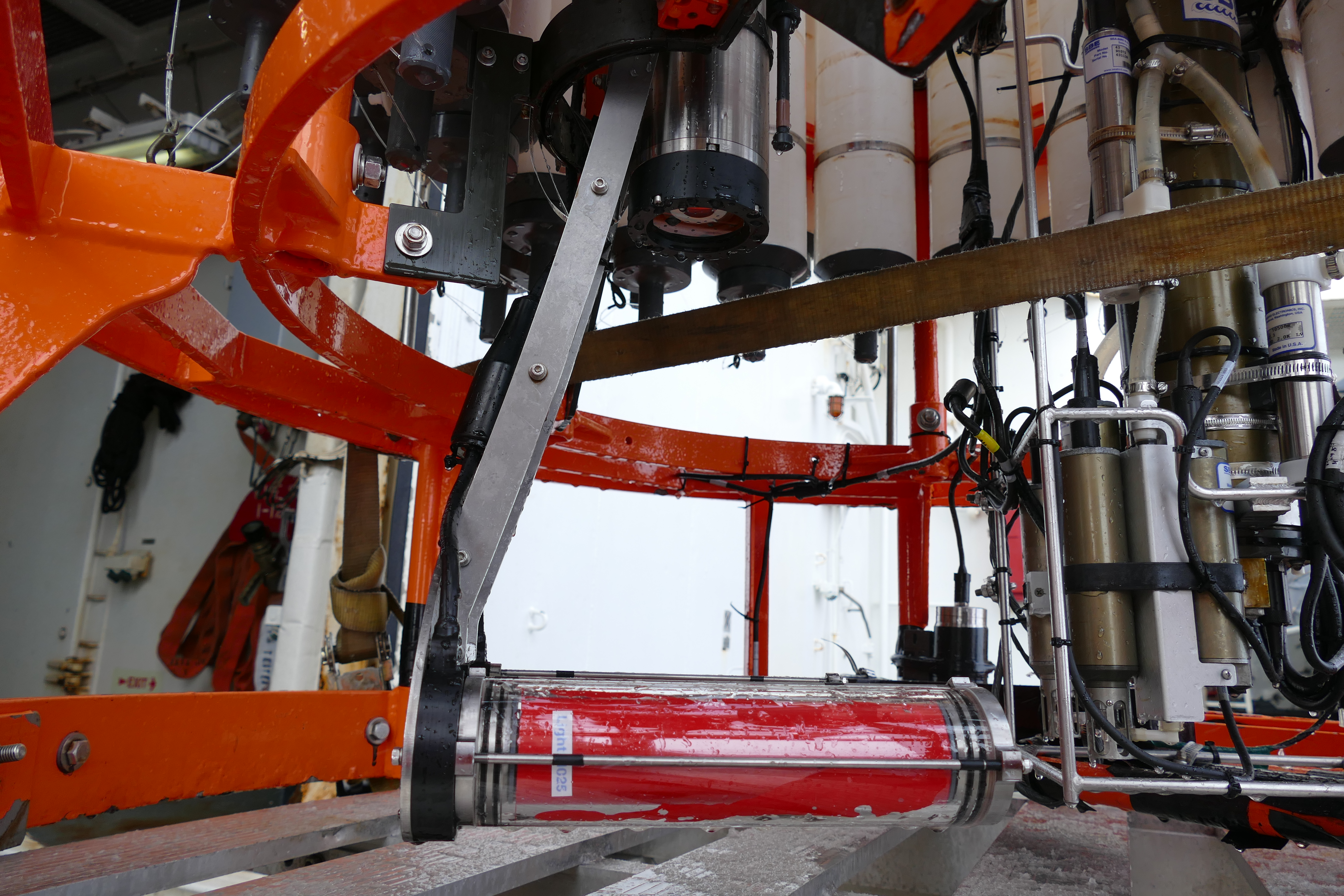 The plankton profiler has two red cylinders (one visible here) that illuminate a plane between them. A downward-looking camera (silver cylinder with black rim and red lens) records the density and types of plankton imaged on within the plane. Aboard the USCGC Healy at the Mendelev Rise in the Arctic Ocean. 80.02°, -175.40°.