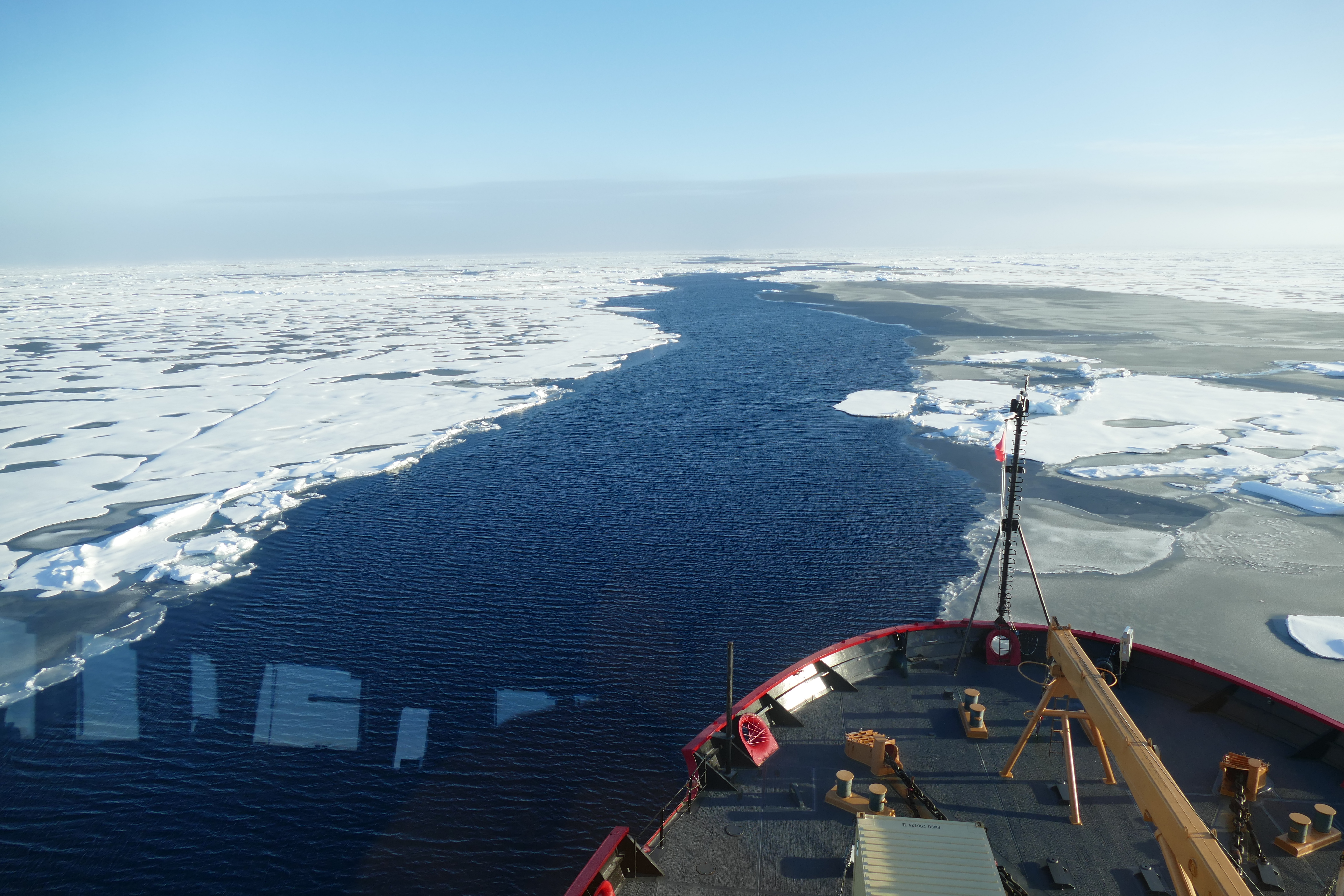 Long north-oriented open water leads such as this one have allowed the team to make faster progress towards the North Pole than expected. Aboard the USCGC Healy at the Mendelev Rise in the Arctic Ocean. 81.23°, 179.10°.