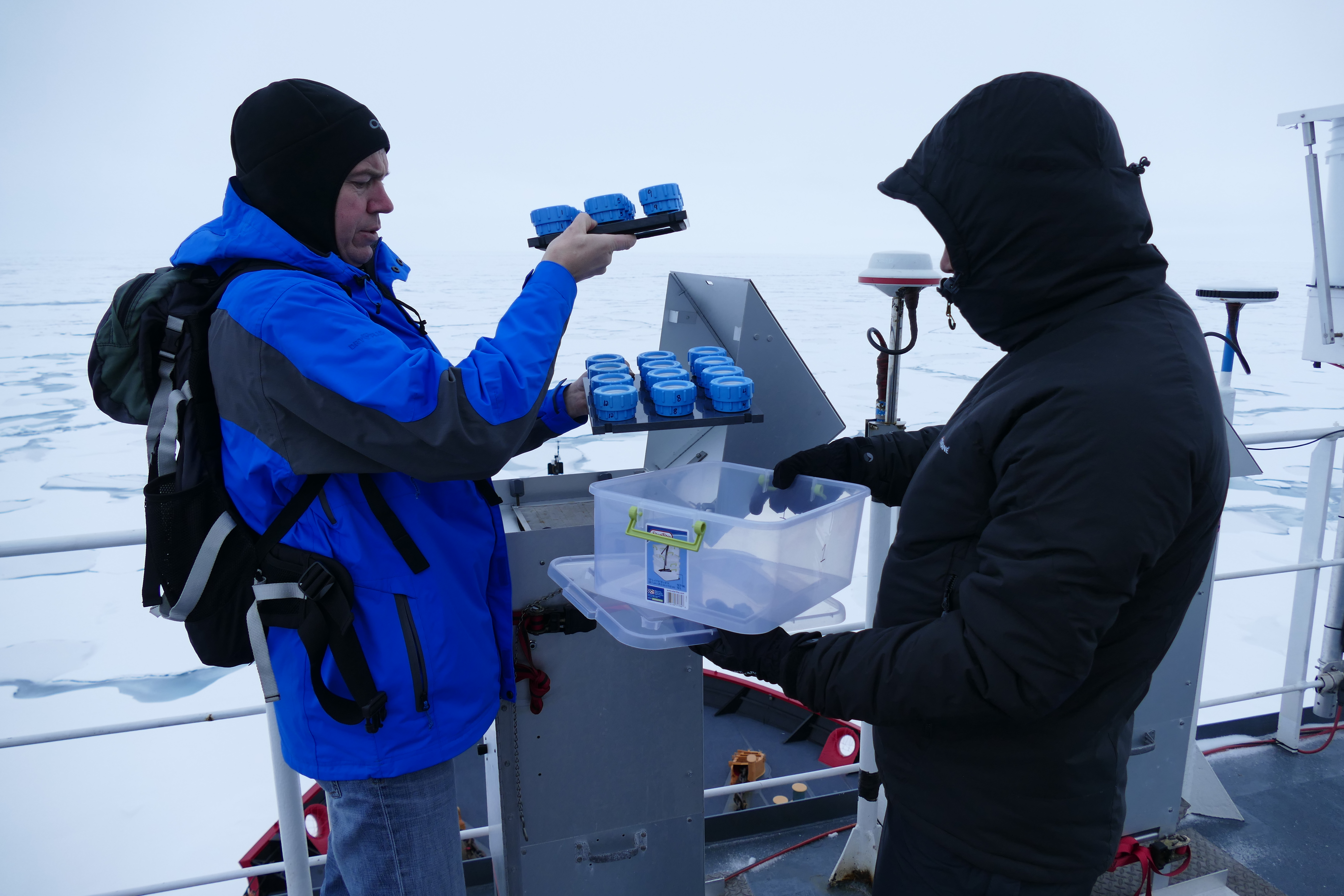 Chris Marsay and Neil Wyatt change filters in an aerosol sampler on the Healy’s flying bridge. Aboard the USCGC Healy in the Makarov Basin in the Arctic Ocean. 86.50°, 173.47°.