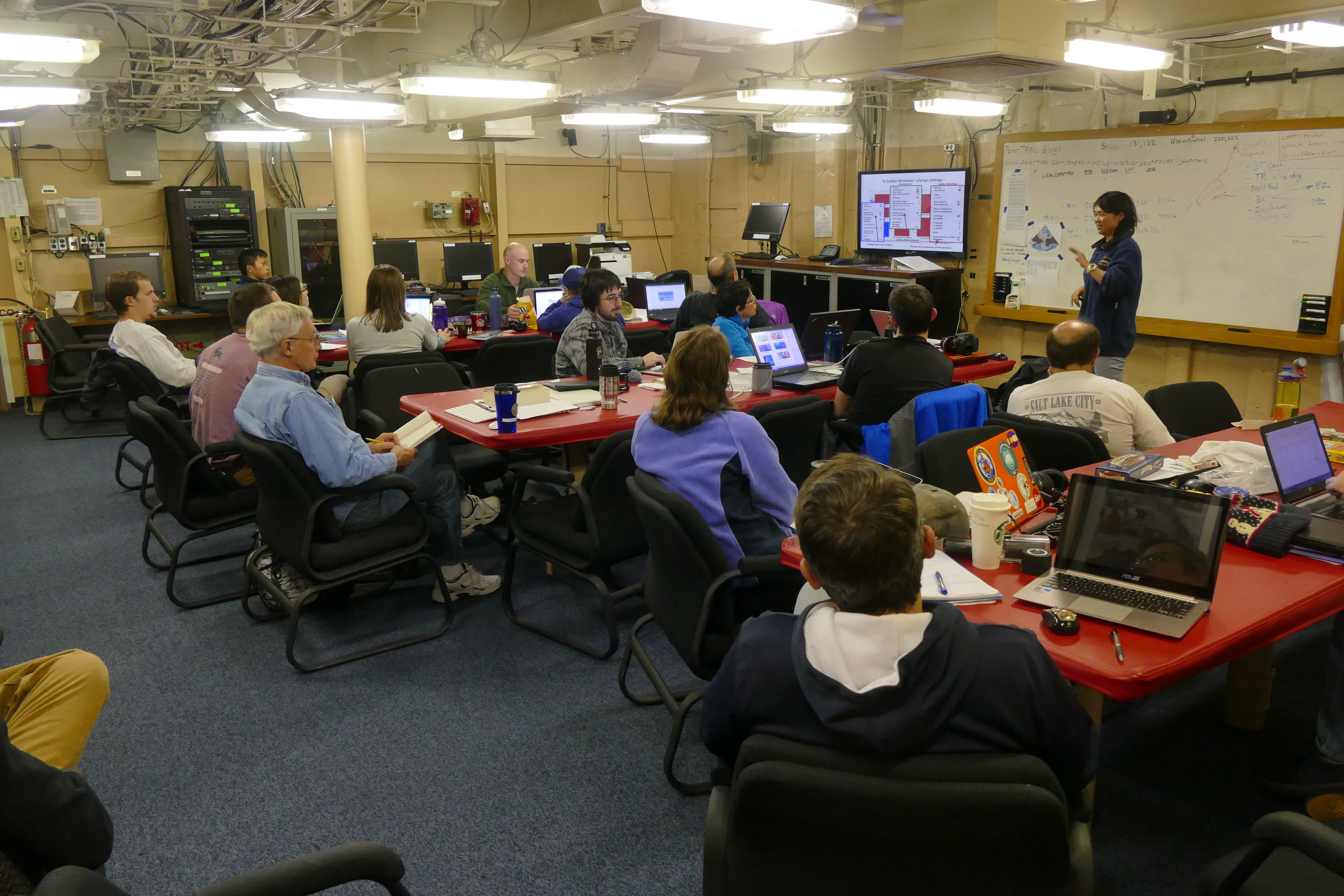 Mariko Hatta presents a class on using Ocean Data View (ODV) in the science conference room. Aboard the USCGC Healy in the Makarov Basin in the Arctic Ocean. 86.50°, 173.47°.