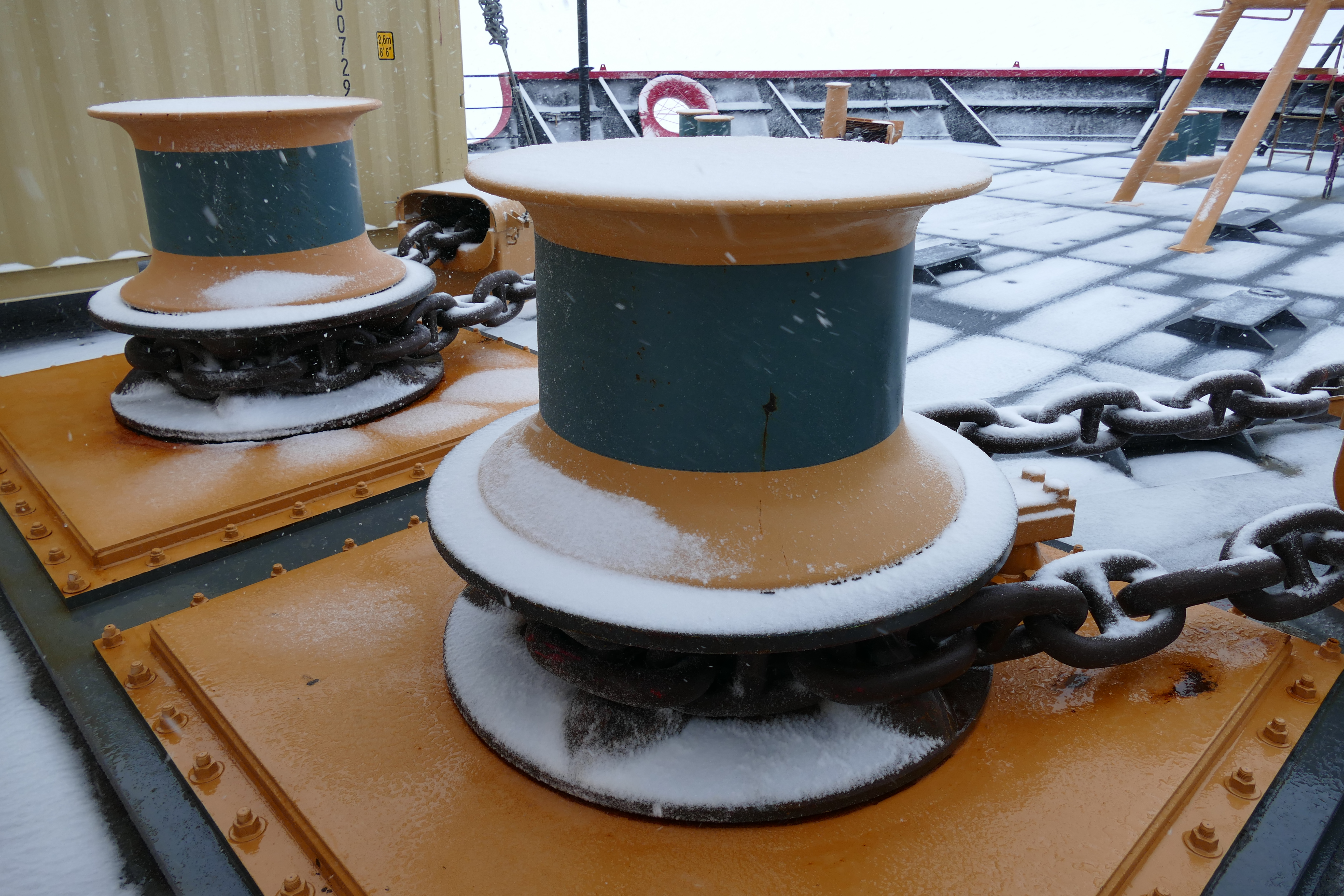 The Healy has two anchor capstans that pull up the heavy anchor chains. Line can also be wrapped around the upper parts of these capstans for heavy hauling. Aboard the USCGC Healy in the Makarov Basin in the Arctic Ocean. 87.58°, 179.96°.