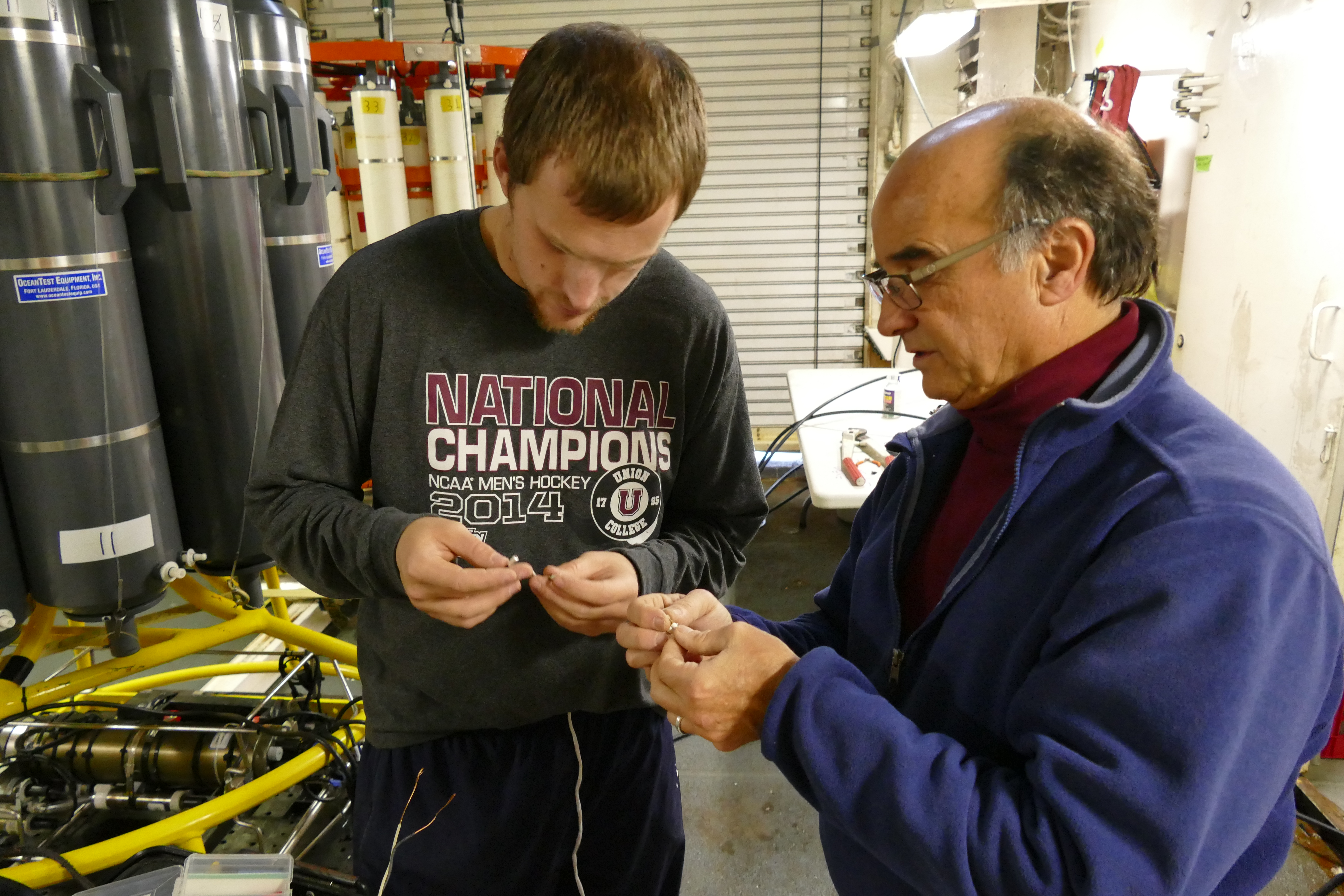 Greg Cutter and Kyle McQuiggan examine the wires needing to be spliced to connect the conducting cable used for GEOTRACES casts to the instruments on the CTD (conductivity, temperature, and depth instrument). Aboard the USCGC Healy in the Makarov Basin in the Arctic Ocean. 88.39°, 177.22°.