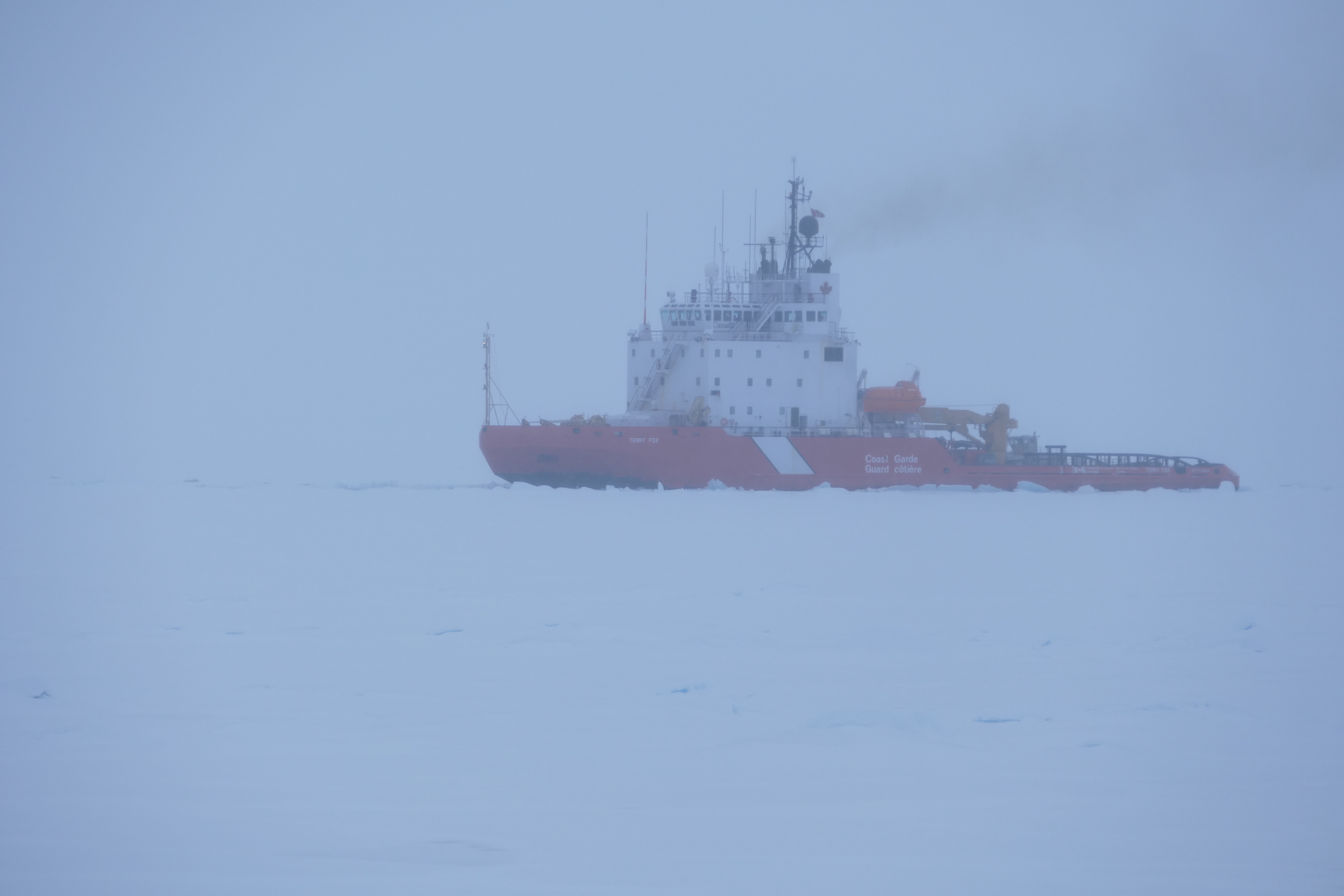 The CCGS Terry Fox follows the path made by the CCGS Louis S. St-Laurent as they head south from a polar expedition. Aboard the USCGC Healy in the Makarov Basin in the Arctic Ocean. 88.39°, 177.22°.