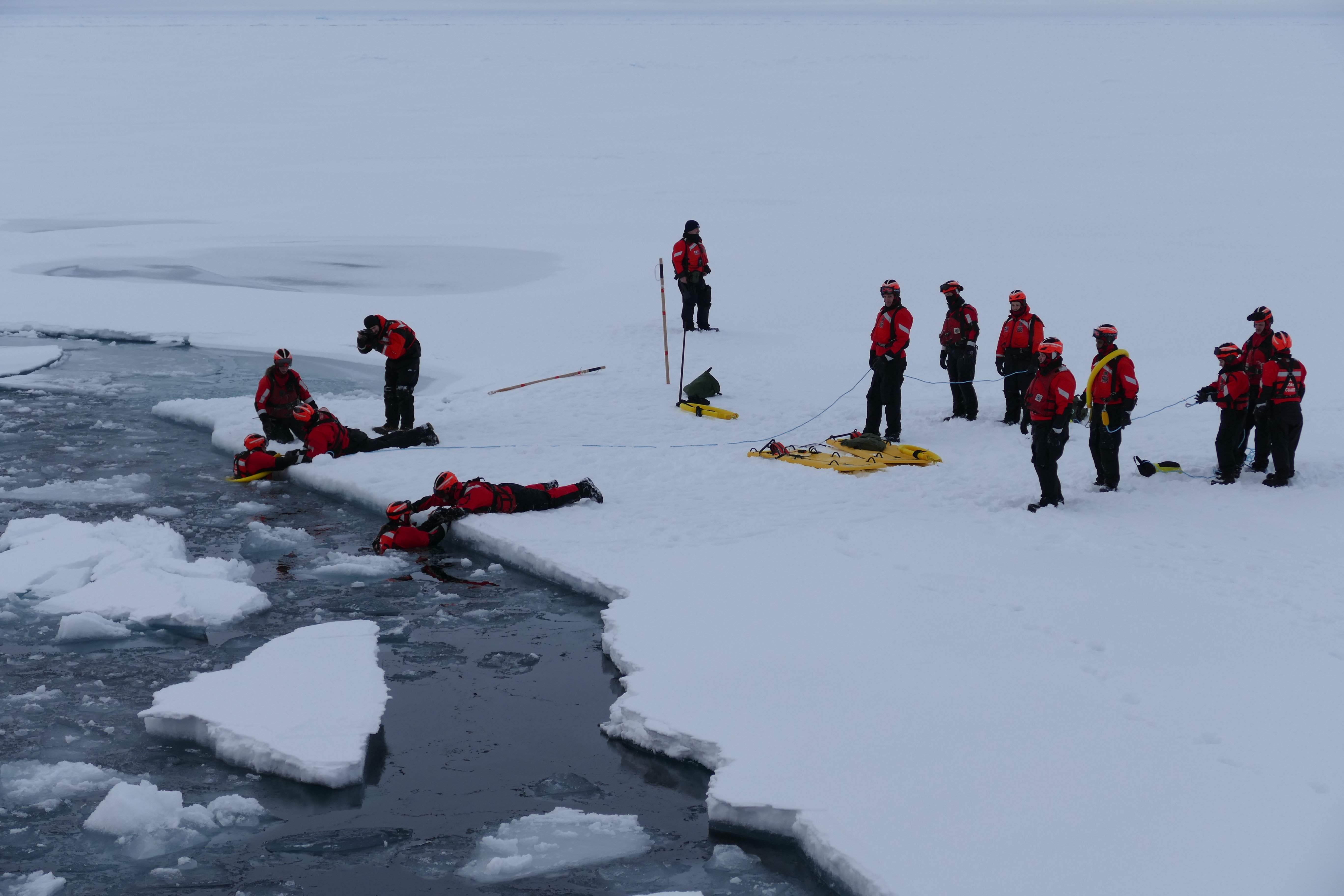 The US Coast Guard took about an hour for ice rescue practice and training before the science team began work on the ice station. Near the USCGC Healy in the Makarov Basin in the Arctic Ocean. 88.39°, 177.22°.