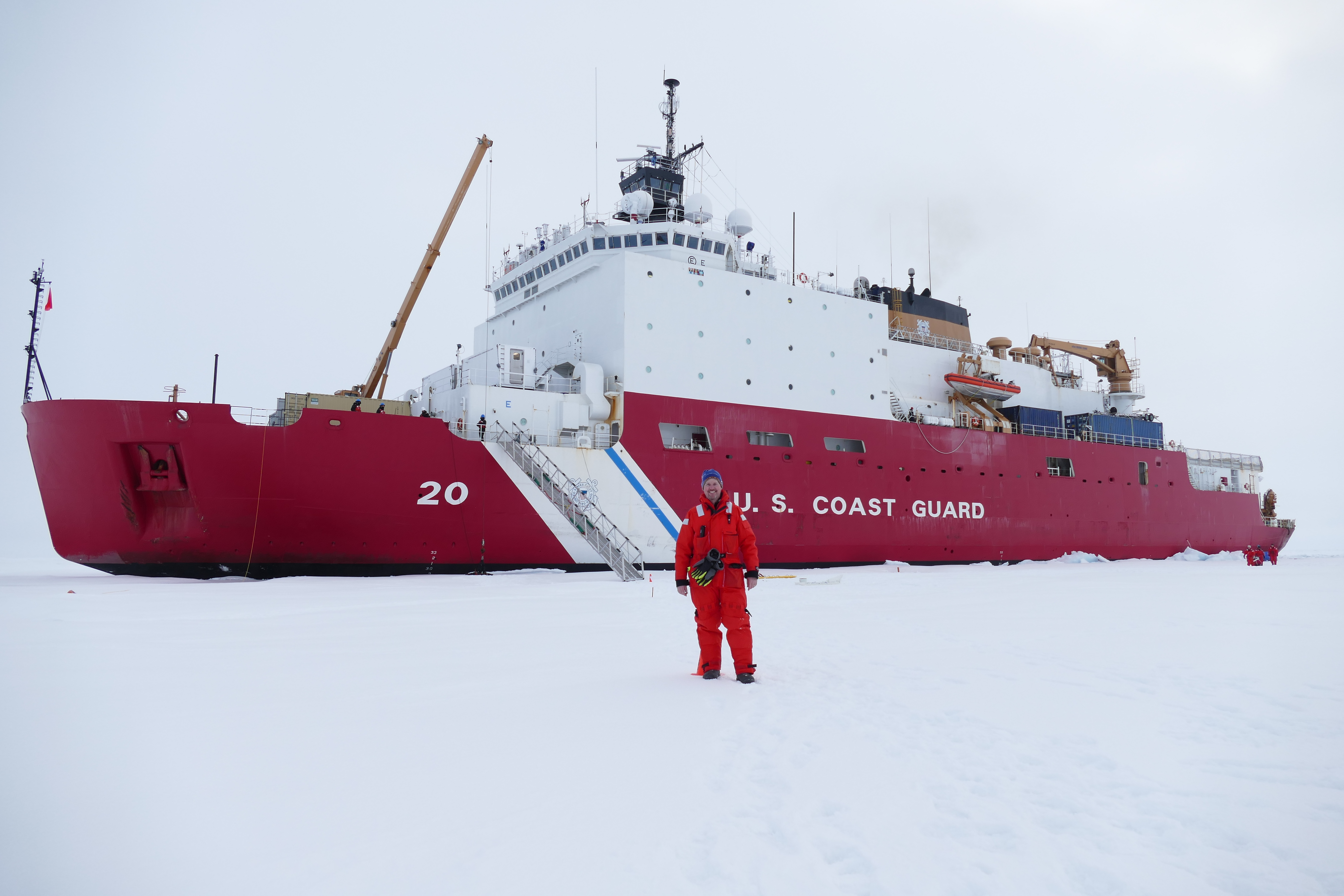 Bill Schmoker stands on sea ice over the deep water of the Arctic Ocean’s Makarov Basin. Next to the USCGC Healy at the Lomonosov Ridge in the Arctic Ocean. 89.30°, -176.52°.