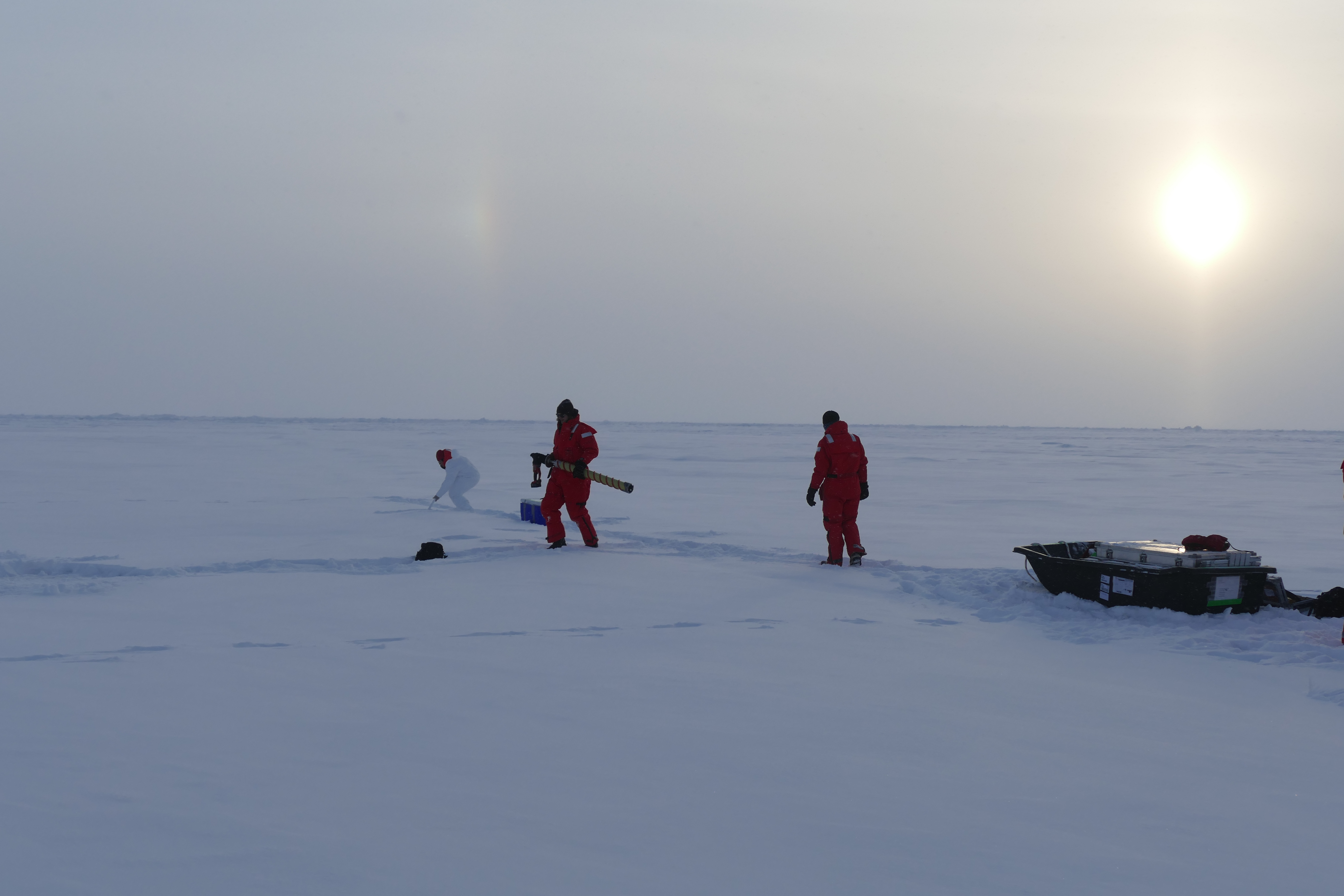 A sun dog appears as the clean ice sampling team sets up their operation at the North Pole ice station. Near the USCGC Healy at the North Pole.