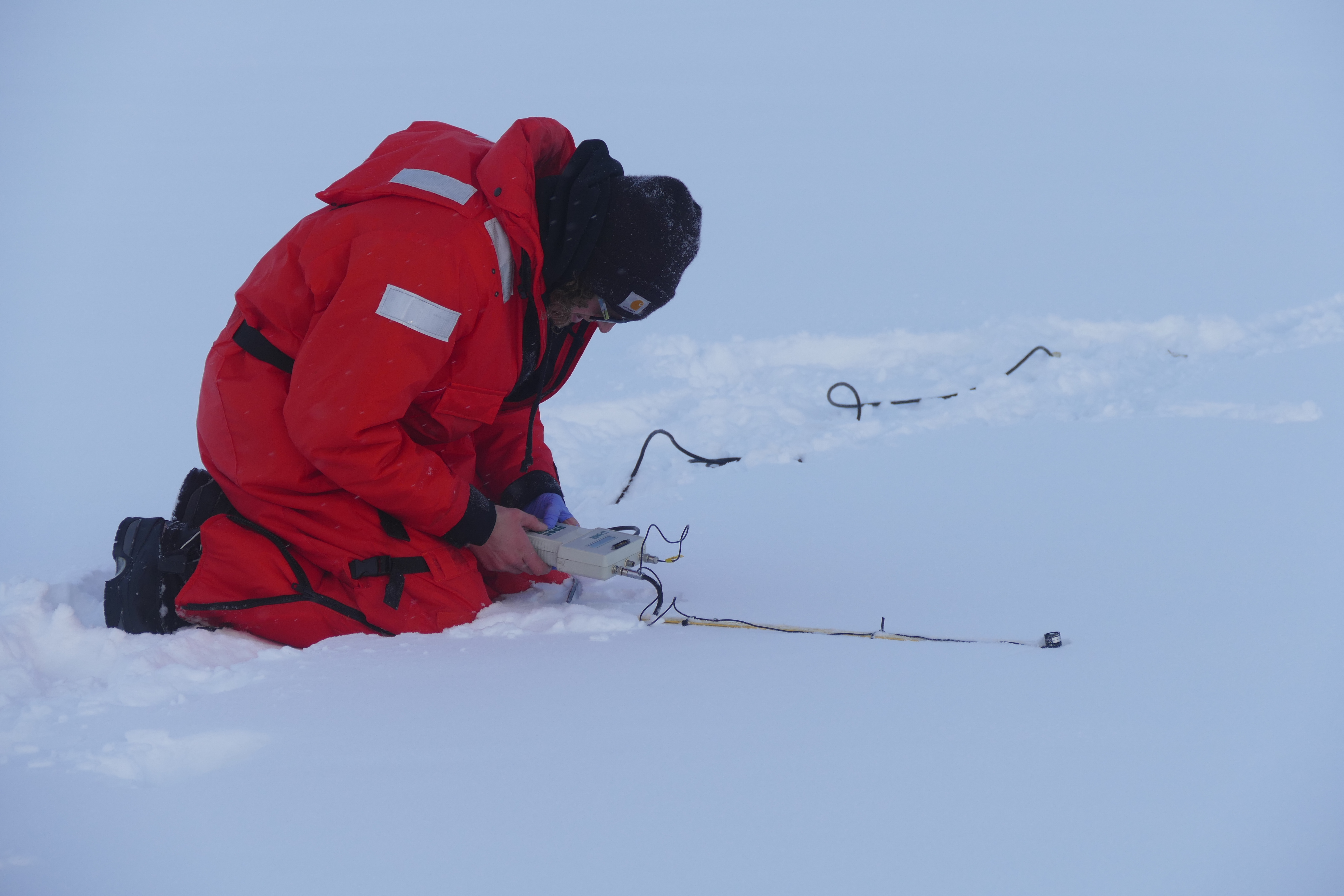Kyle Dilliplaine measures incoming light at the surface and under the sea ice at the North Pole, near the USCGC Healy.