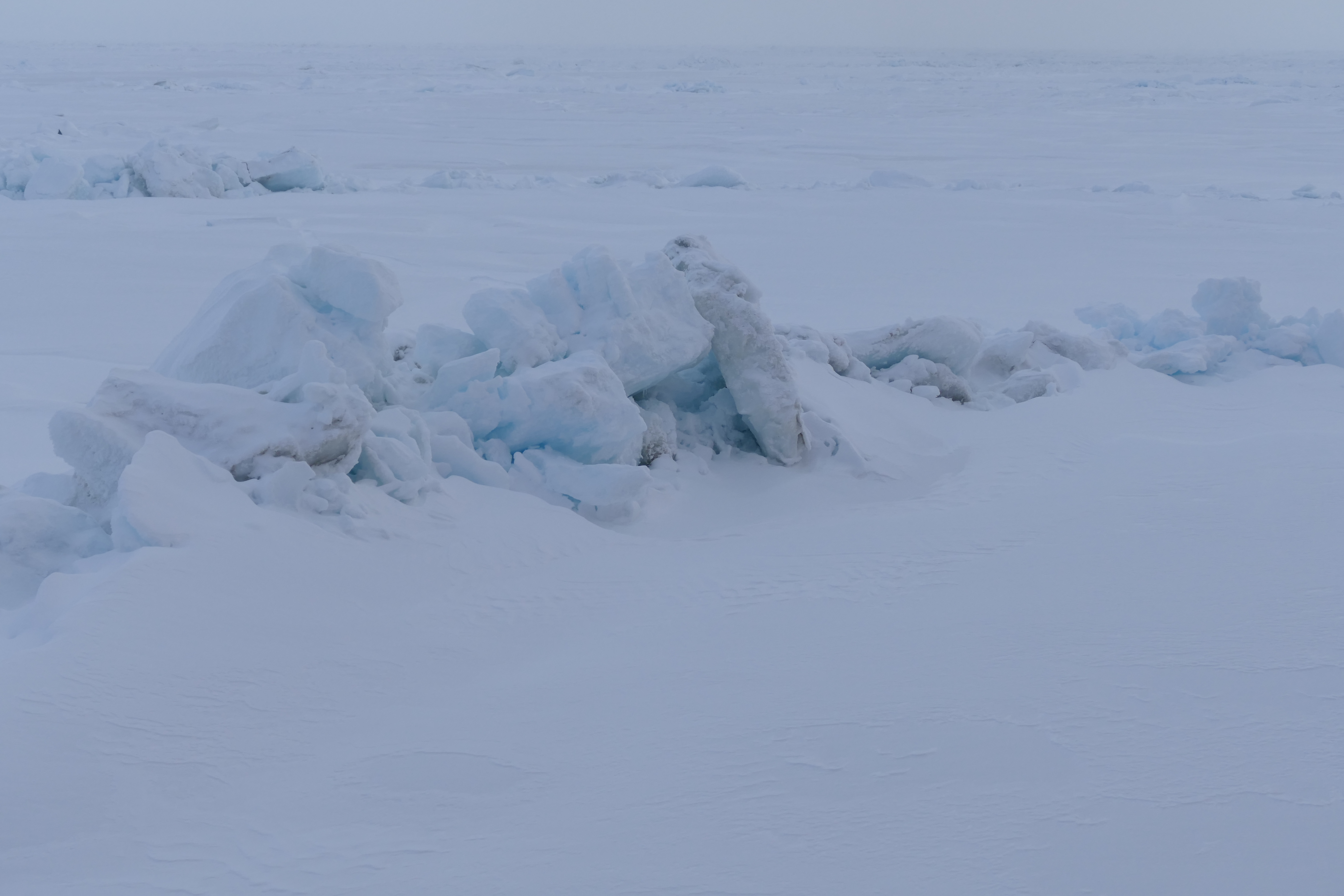 Dirty ice in this pressure ridge is visible despite a fresh snow cover on its surface. Aboard the USCGC Healy at the Lomonosov Ridge in the Arctic Ocean. 89.00°, -15.37°.