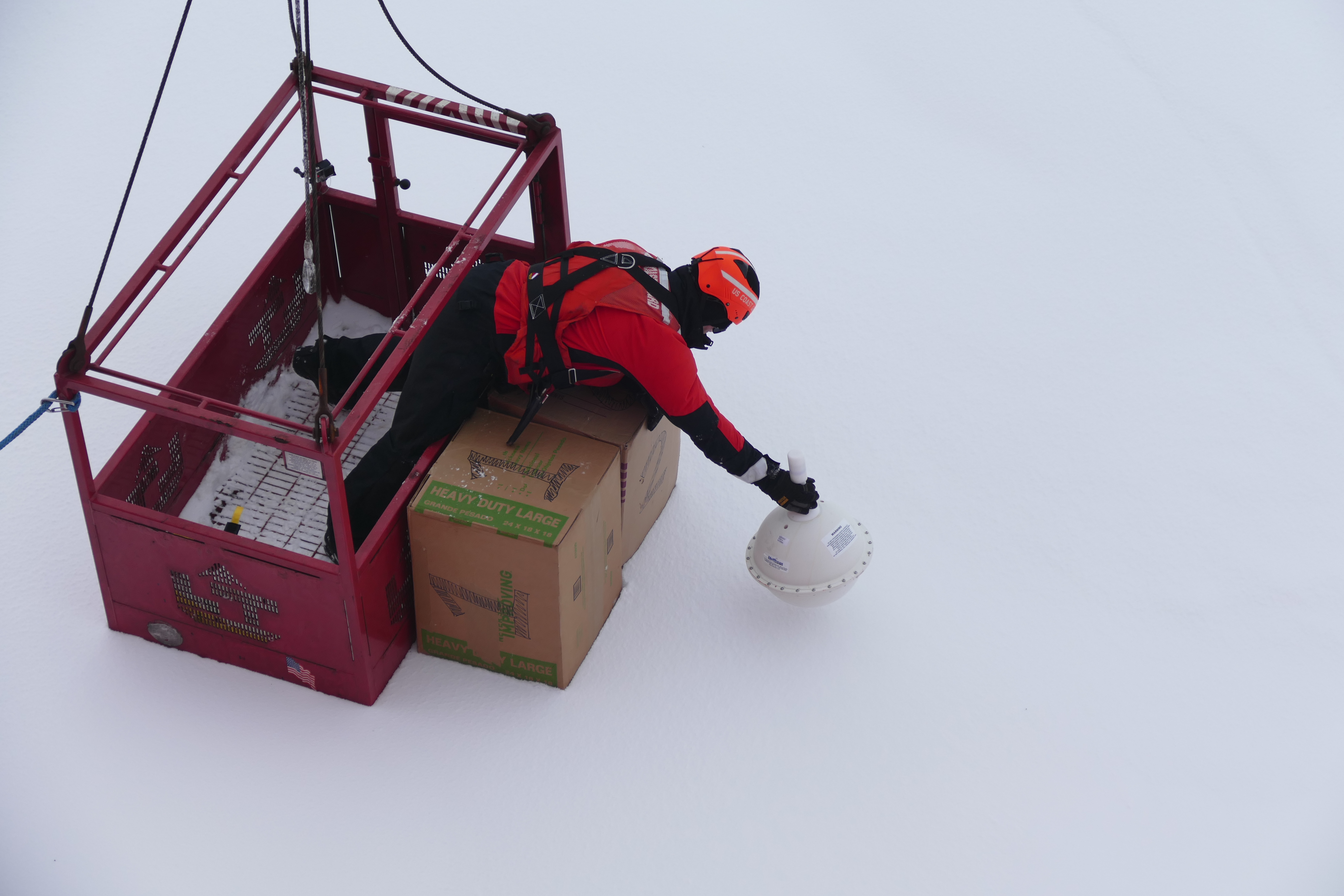 A USCGC Healy crew member places Float Your Boat boxes and an SVP buoy on the ice. Aboard the USCGC Healy in the Makarov Basin in the Arctic Ocean. 86.70°, -149.48°.