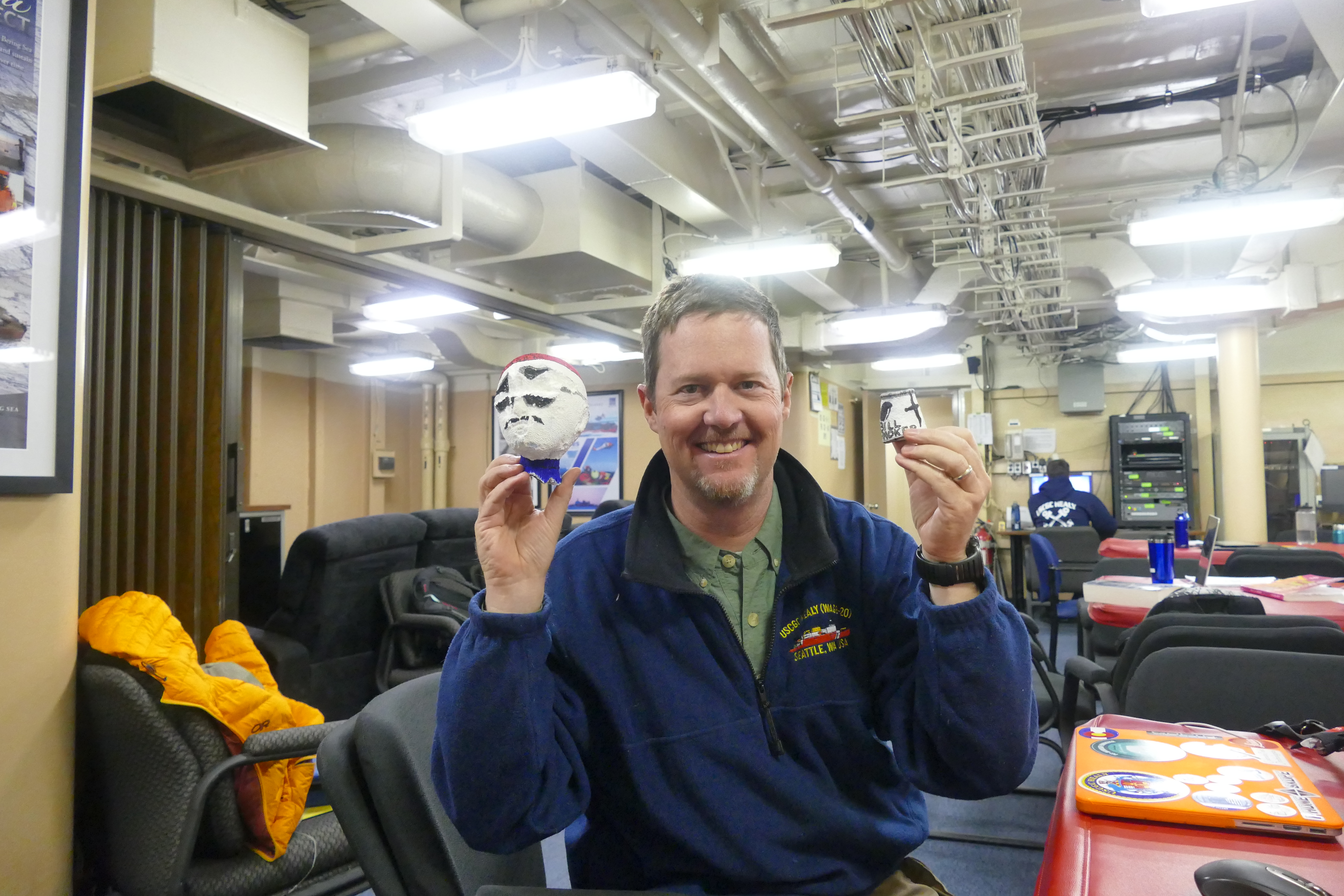 After a trip to water ~4200 meters deep, the styrofoam cup and head show signs of a high-pressure situation. Aboard the USCGC Healy at the Alpha Ridge in the Arctic Ocean. 85.83°, -150.10°.