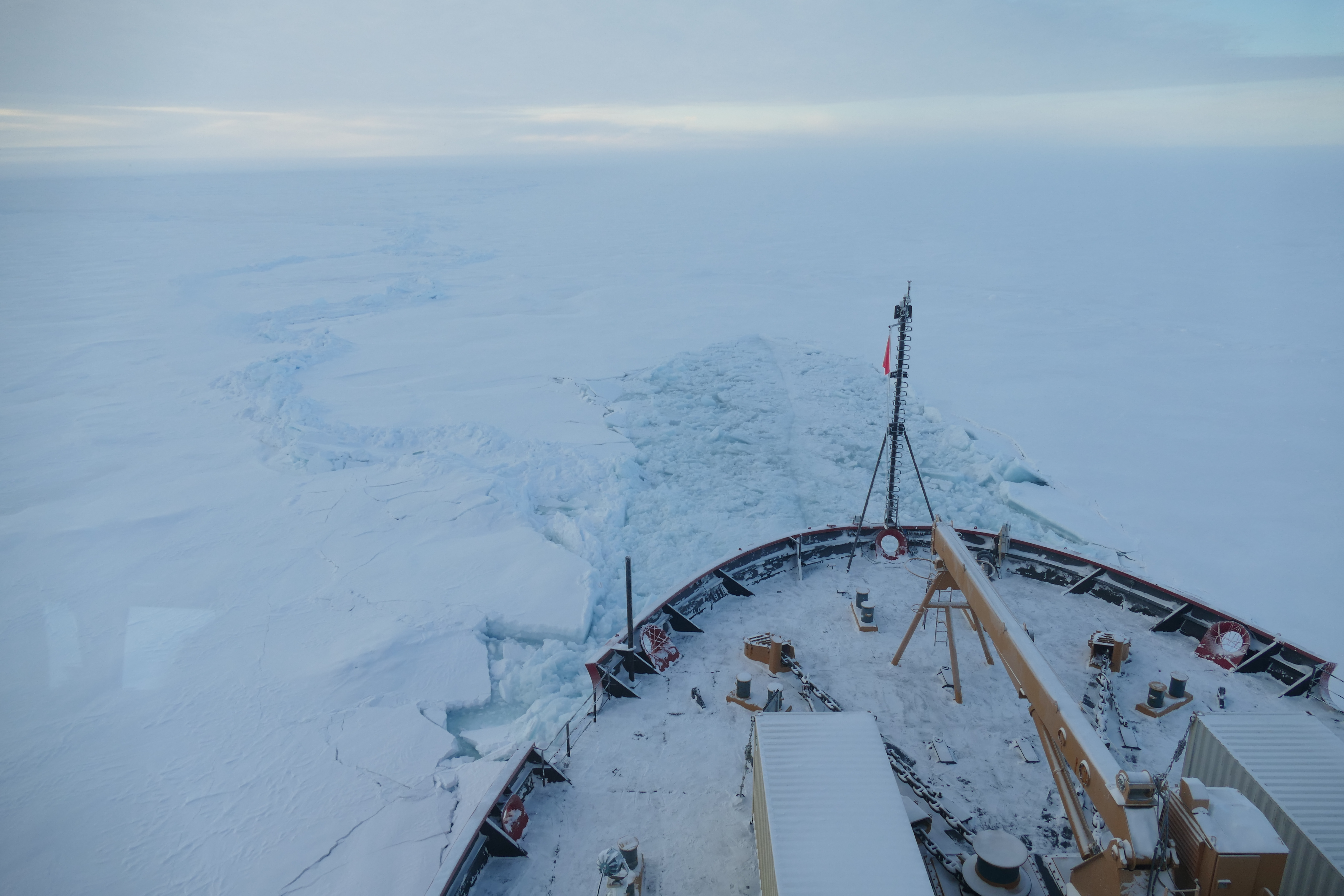 The Healy is in sea ice thick enough to occasionally stop the ship’s forward progress. The Healy must back up, go forward again with enough speed, and ram into the sea ice to try to get through the constriction. Aboard the USCGC Healy at the Alpha Ridge in the Arctic Ocean. 84.17°, -150.02°.