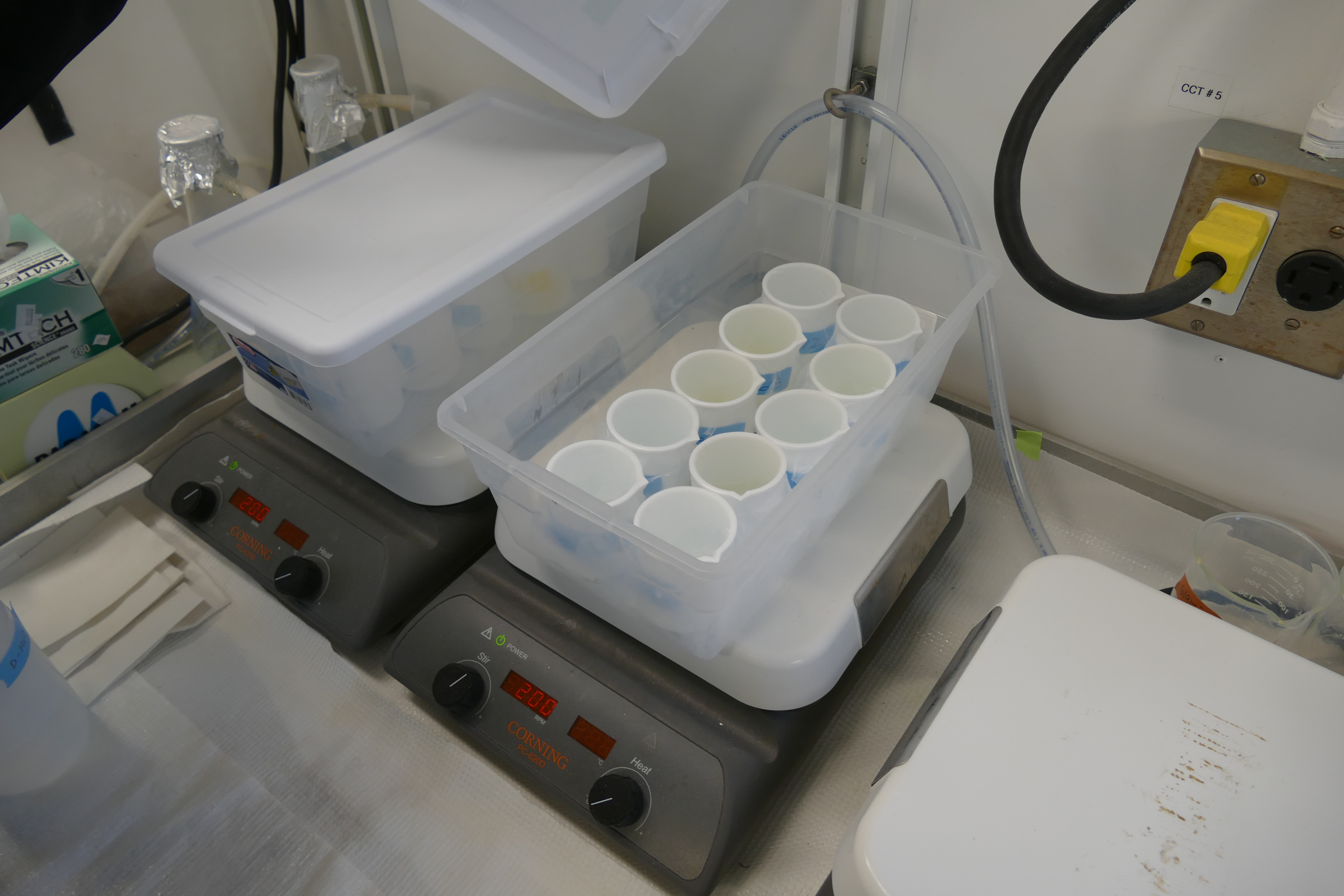 The concentrated polonium samples are placed in small Teflon beakers, which are left on stirring plates for about 20 hours to give time for the polonium to electroplate onto the silver planchets in each beaker. Aboard the USCGC Healy in the Canada Basin. 74.95°, -150.23°.