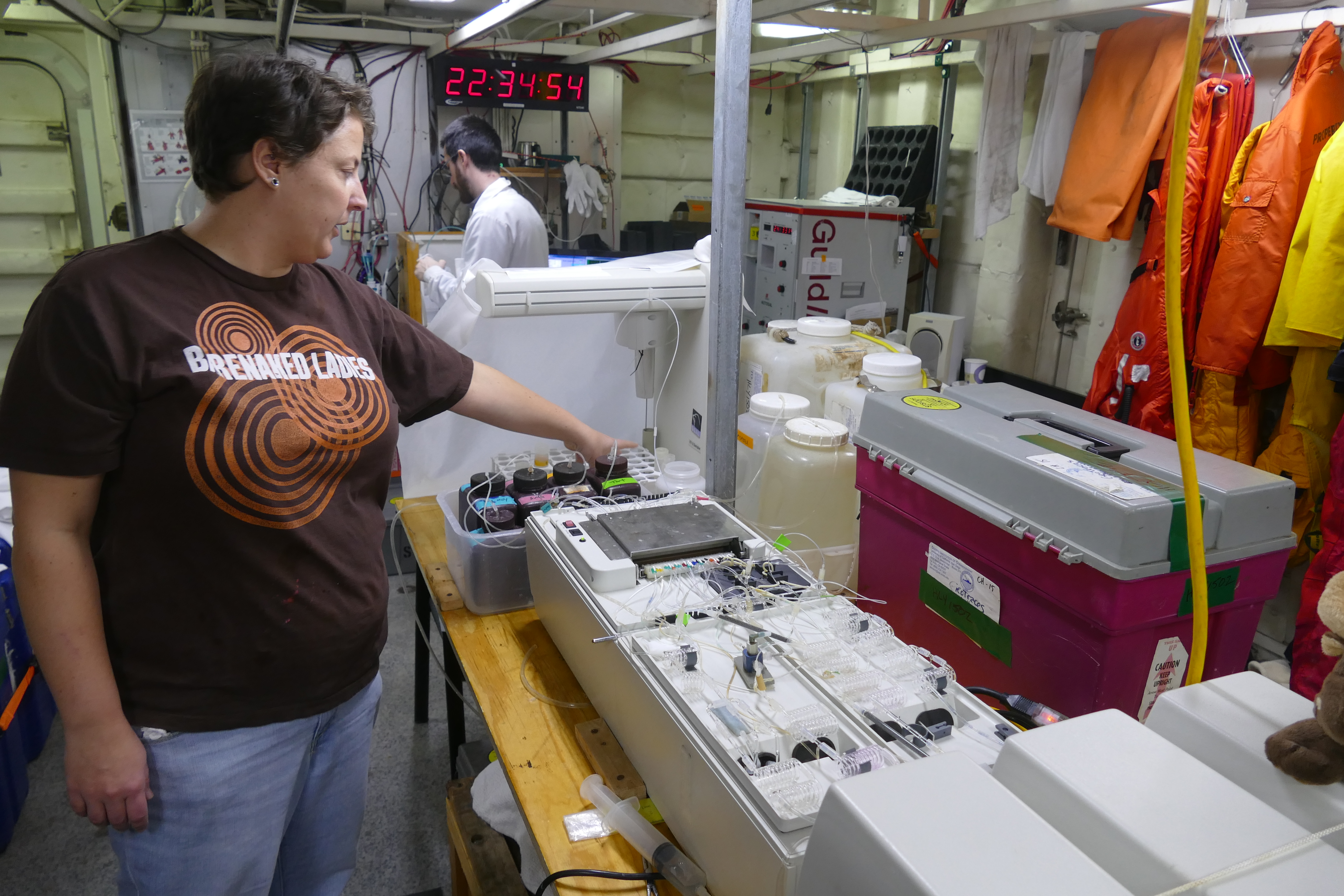 Melissa Miller starts a batch of water samples through the flow-through nutrient sampling system. Aboard the USCGC Healy in the Canada Basin. 74.95°, -150.23°.