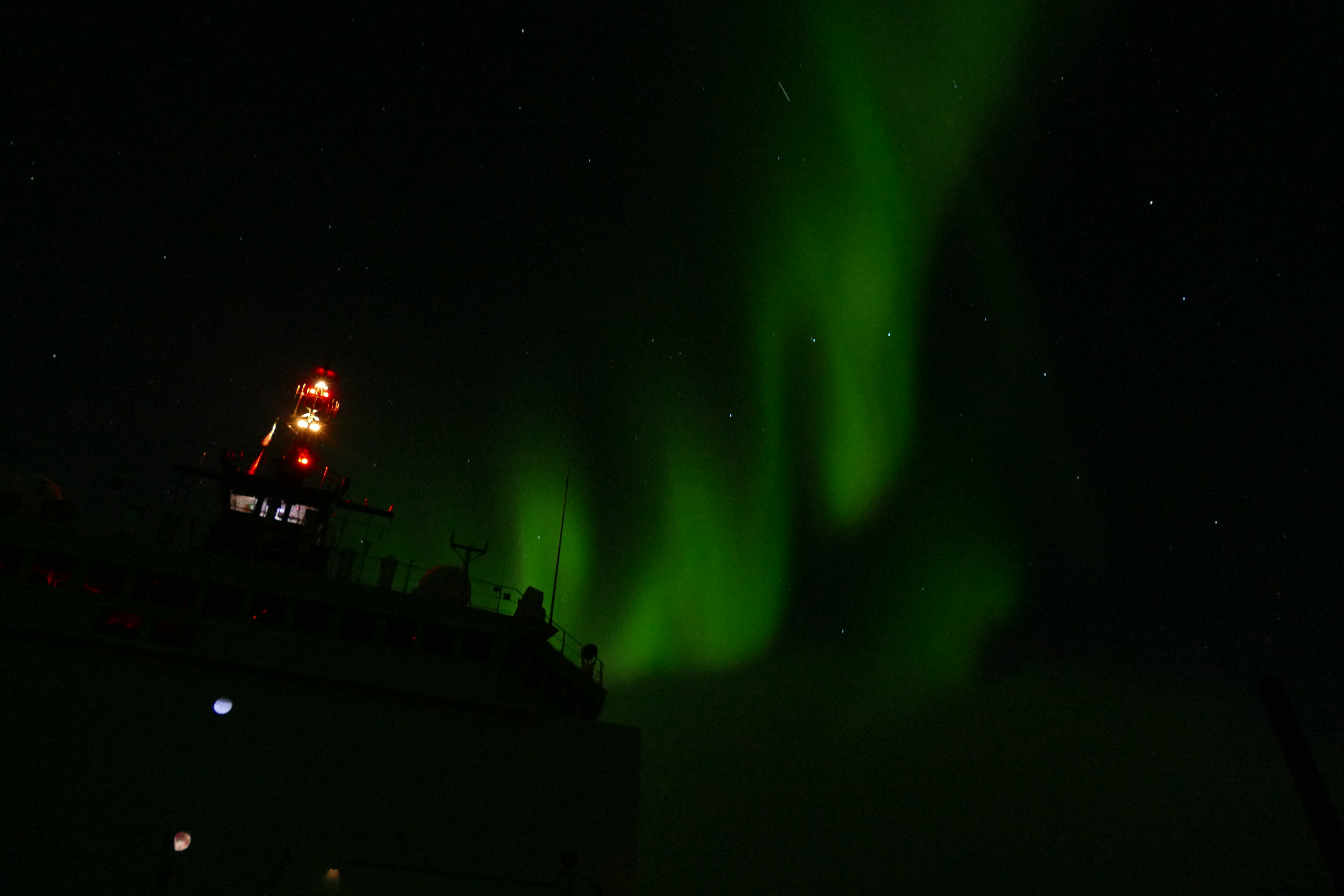 The aurora borealis over the USCGC Healy in the Chukchi Slope. 72.92°, -159.20°