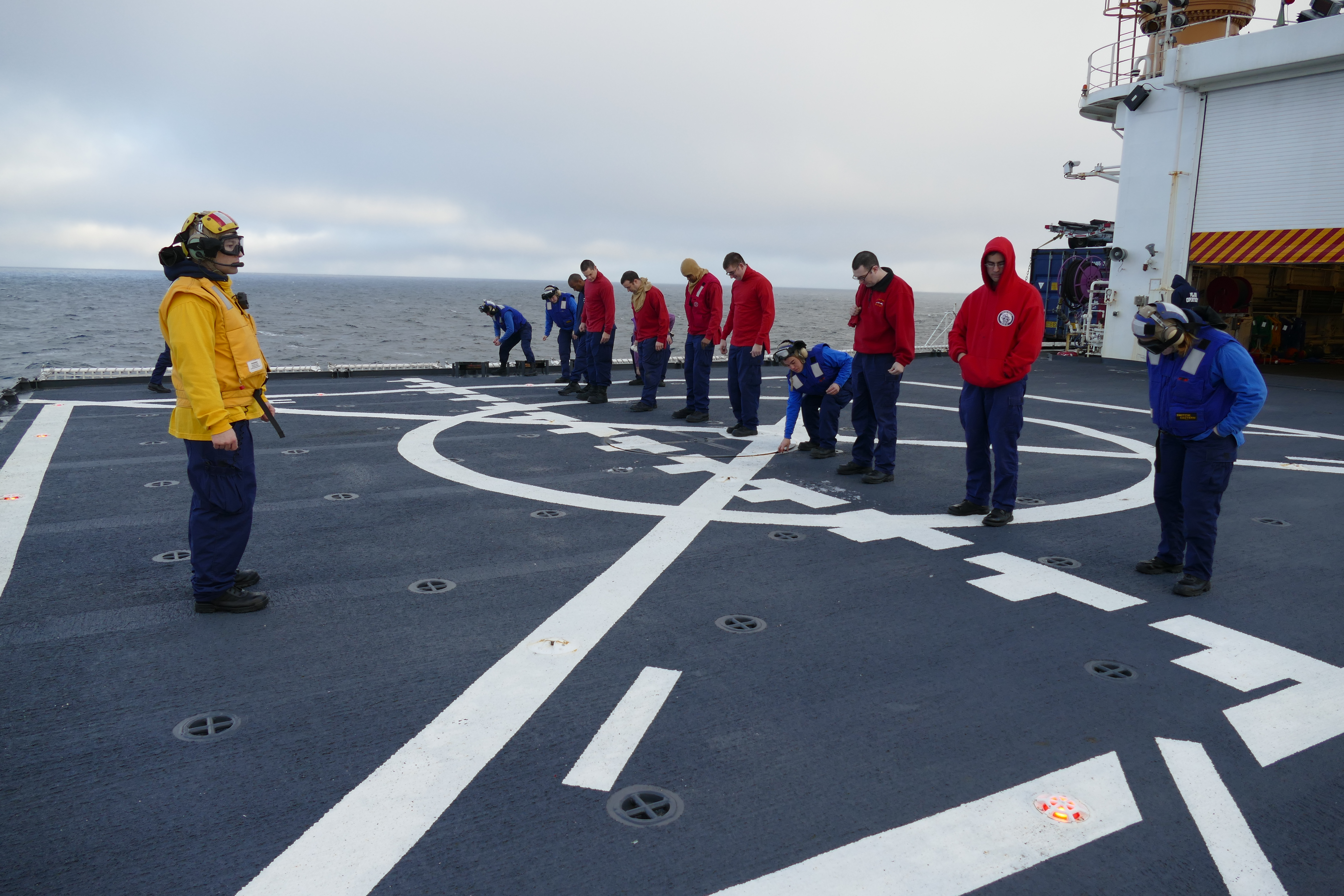 Before the helicopter arrives, a line of crew members advances along the flight deck in a line to look for any loose debris that could be swept up in the rotor wash. Aboard the USCGC Healy in the Chukchi Shelf. 72.02°, -162.50°.